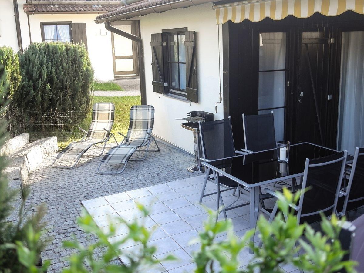 Die Süd-Terrasse ist möbliert mit einem Gartentisch und Stühlen, außerdem gibt es zwei Sonnenliegen. Für den Sonnenschutz gibt es eine Markise. Außerdem ist ein Holzkohle-Grill vor Ort, der genutzt werden darf. Grill nach dem Grillen bitte immer reinigen!