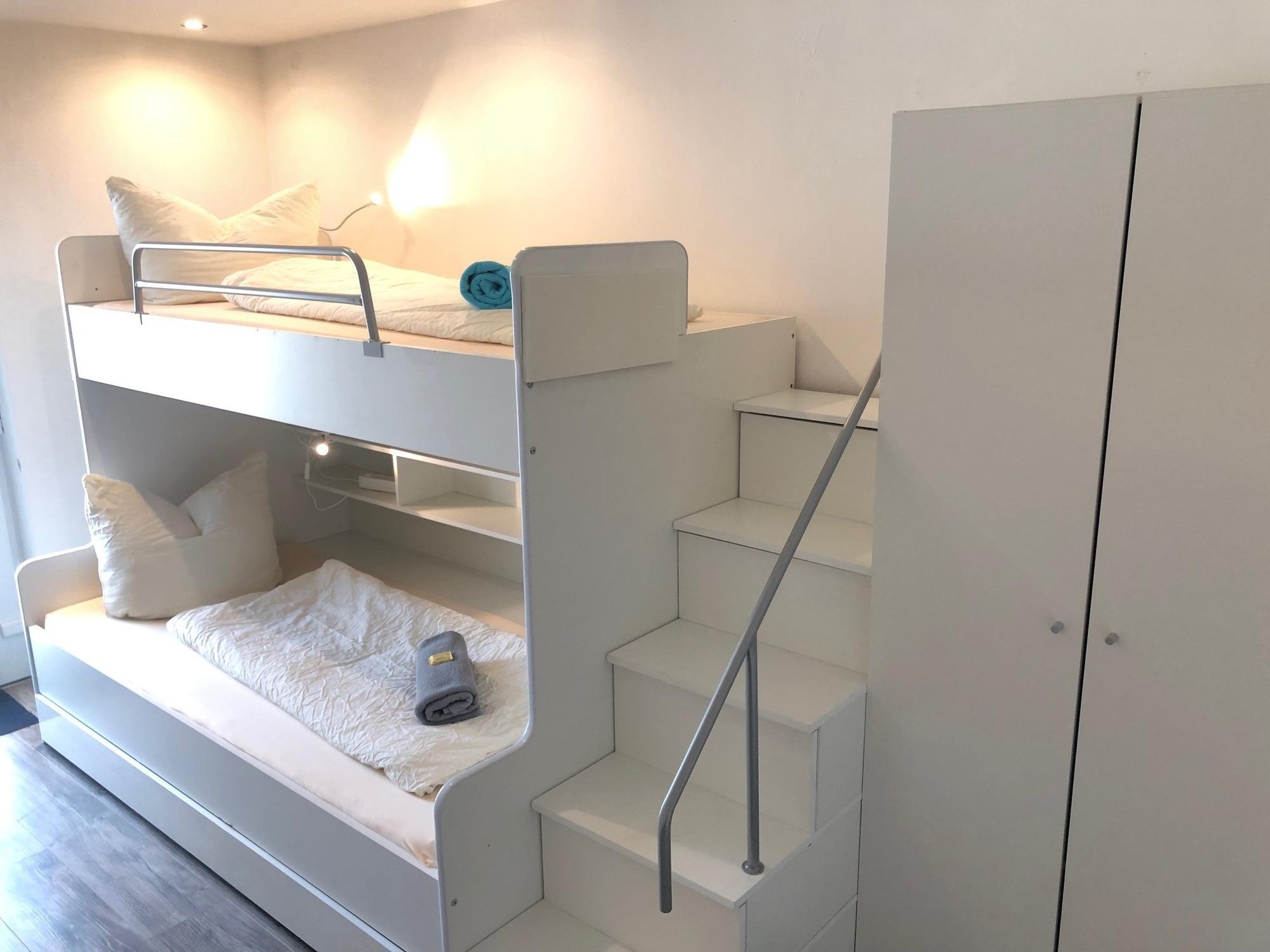 Im Schlafzimmer befinden sich ein 2 er und ein 3 er Etagenbetten , die auch für Erwachsene geeignet sind und Platz für 5 Personen bieten. In dem Zimmer gibt es dann auch noch ein gemütliches Federkern-Schlafsofa. Dieses Schlafzimmer verfügt über einen eigenen Eingang zum Innenhof. Des Weiteren gibt es einen geräumigen Funktionsraum mit einer großen Sitzgruppe zum Essen und Verweilen. In diesem Raum steht zudem ein riesiges King-Size Doppel-Lederbett zur Verfügung, dessen Bettzeug tagsüber im darunter liegenden Bettkasten verstaut werden kann. Zwei bequeme Federkern-Schlafsofas bieten sowohl Wohn- als auch Schlafkomfort. Zwischen den Räumen befindet sich eine voll ausgestattete Küchenzeile. Die Wohnung verfügt über ein Duschbad mit WC sowie ein separates WC.