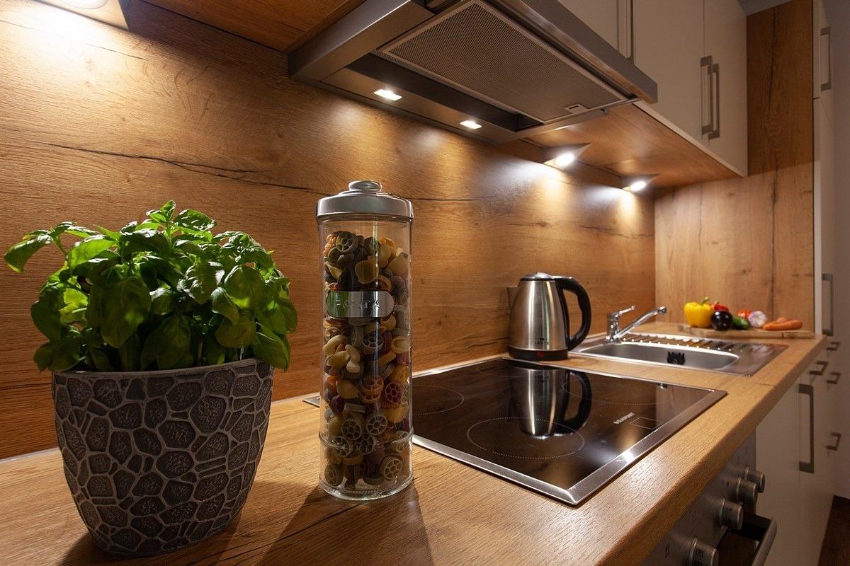 Das Wohn- und Esszimmer lädt zum Verweilen ein und verfügt über eine voll ausgestattete Küche mit Herd, Kühlschrank, Spülmaschine, Filterkaffeemaschine, Wasserkocher, Toaster usw. sowie ein bequemes Schlafsofa.
