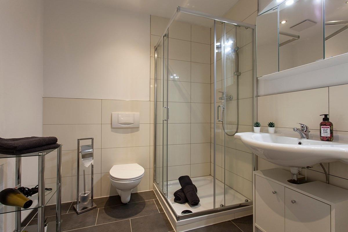 Das moderne Bad mit Dusche rundet das Angebot ab.