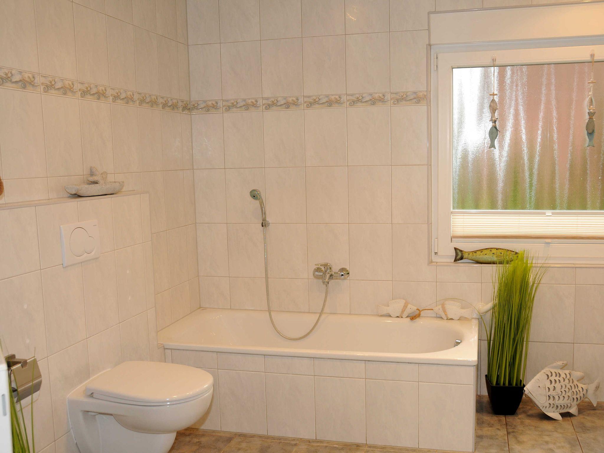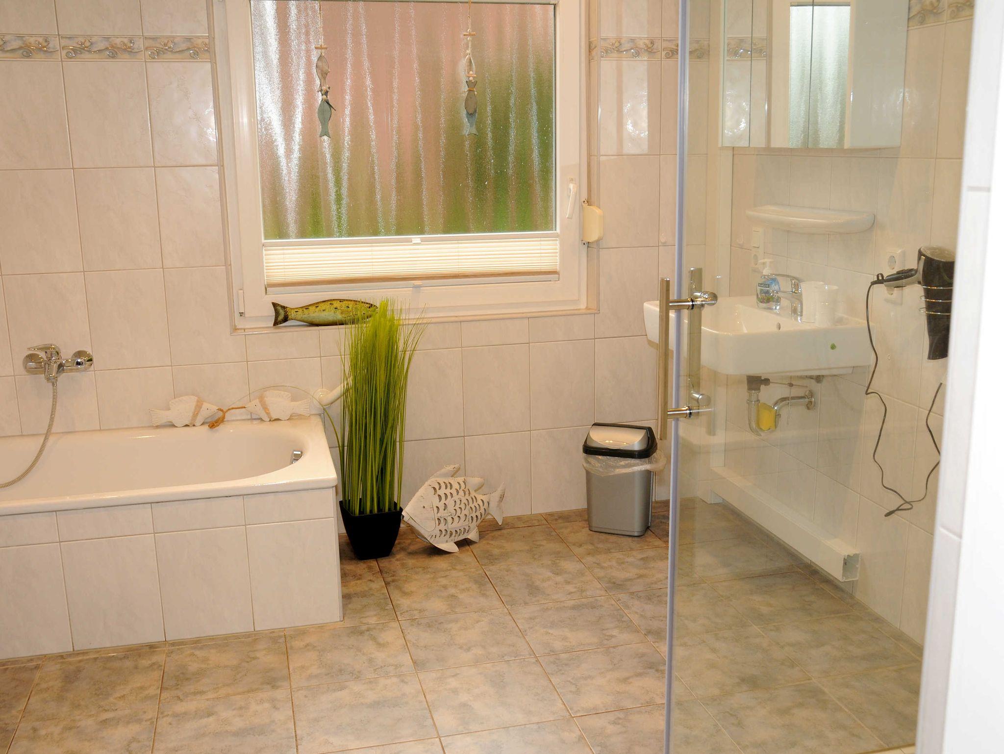 Das Bad ist mit 12 m² geräumig, beinhaltet eine ebenerdige Dusche mit großem Eingang, WC und Badewanne, ein Föhn ist ebenfalls vorhanden.