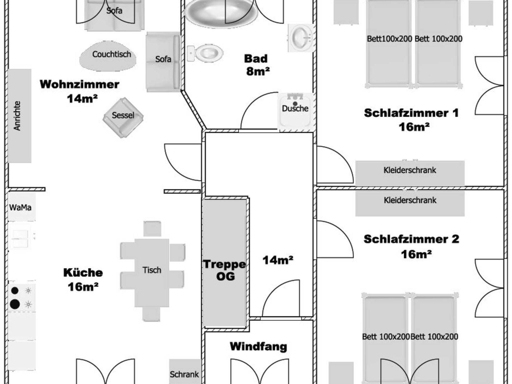 Im Erdgeschoss befinden sich weiter zwei gemütliche, modern eingerichtete Schlafzimmer mit Doppelbetten sowie eine neue, komplett ausgestattete, moderne Einbauküche inkl. Geschirrspülmaschine, Waschmaschine, E-Herd mit Ofen, Mikrowelle, Eierkocher, Kaffeemaschine und Toaster, an die offene Küche gliedert sich das Wohnzimmer mit Ledergarnitur, Kuschelkissen und Decken, Flachbildfernseher und Stereoanlage. Im ganzen Haus 50 Mbit WLAN.