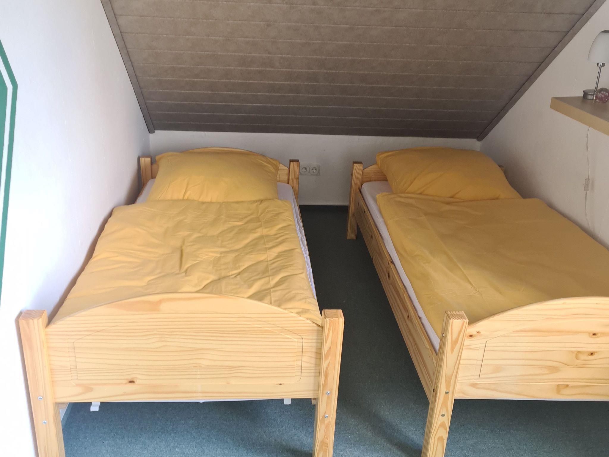 Im ersten Stock befinden sich zwei Schlafzimmer (1 Zimmer mit einem 180cm x 200cm Bockspringbett + 1 Zimmer mit zwei Einzelbetten) und das Badezimmer mit Badewanne und Dusche.