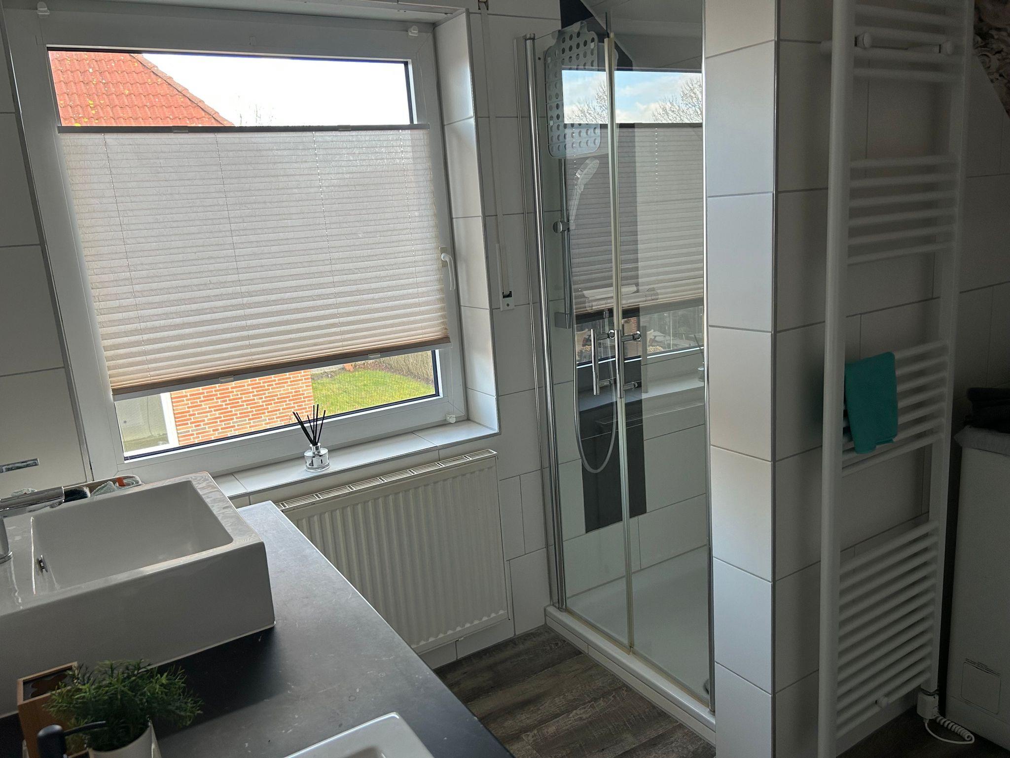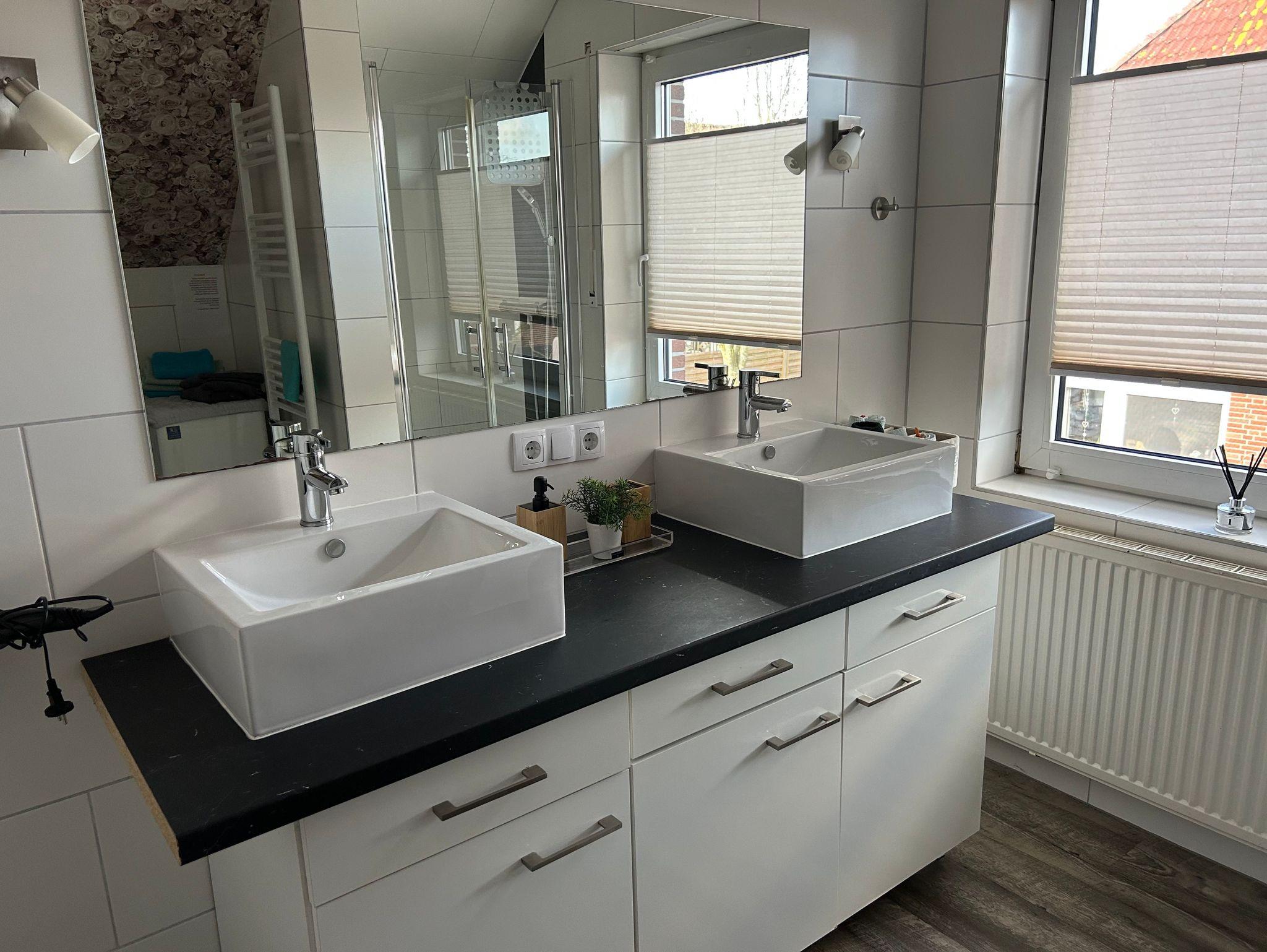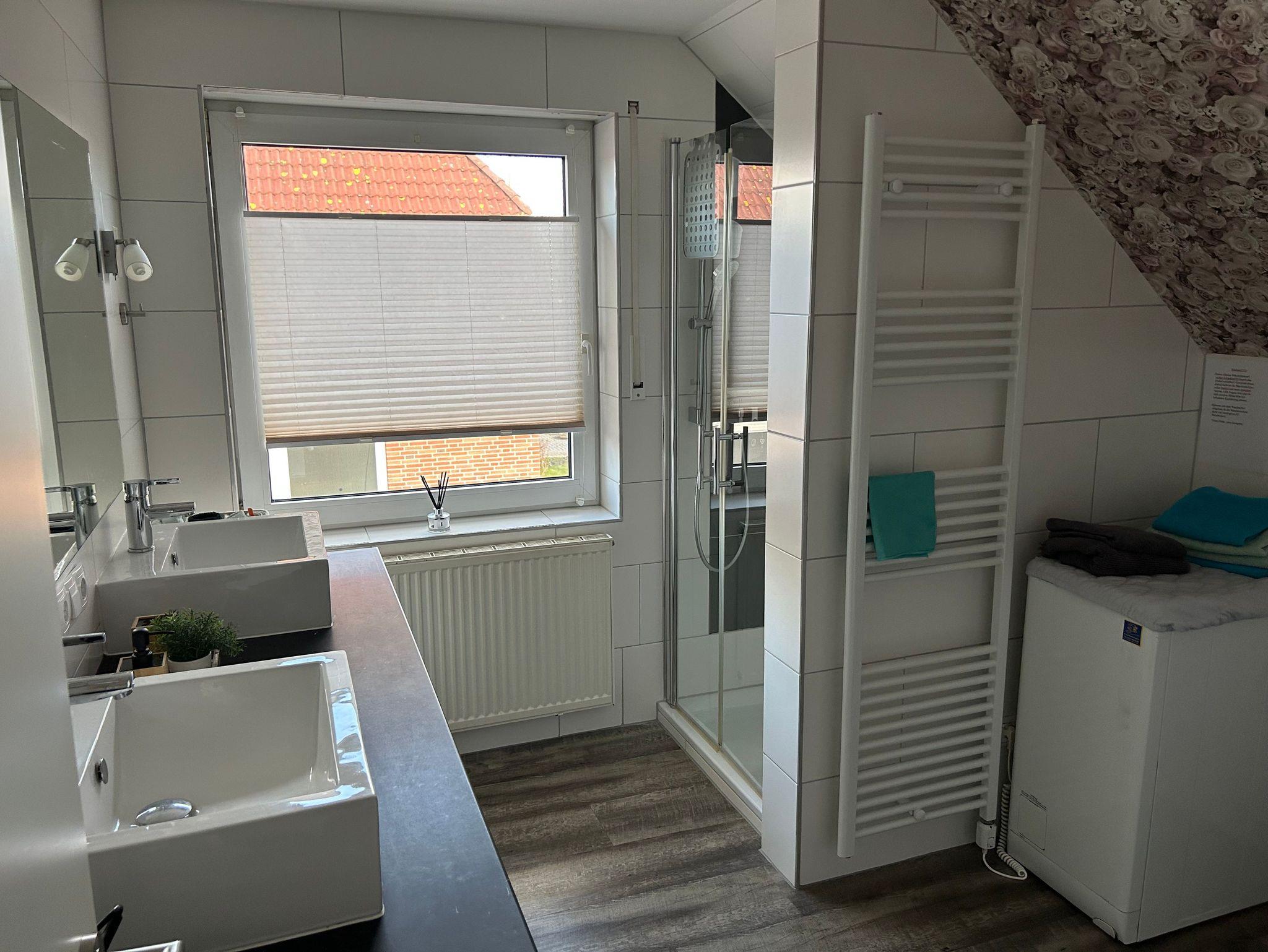 Im modernen Bad befindet sich eine Dusche, ein Doppelwaschbecken, eine Waschmaschine und ein WC.