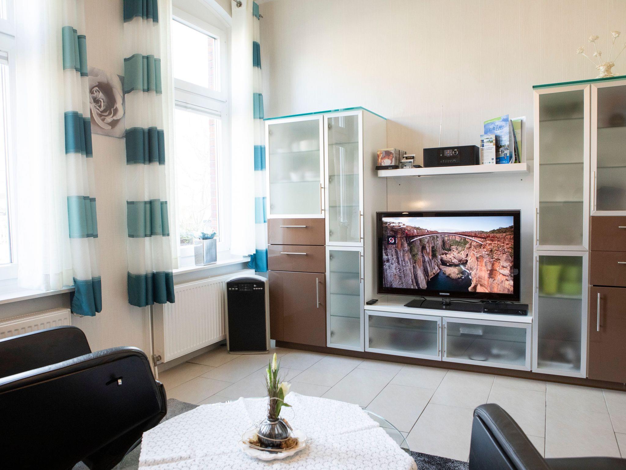 Schöne 5 Sterne Nichtraucher-Ferienwohnung inmitten der Stadt Leer. 95 qm für bis zu sechs Personen, Wohnzimmer, 3 Schlafzimmer, Küche, 2 Badezimmer. Sehr geräumig und schön eingerichtet. Alles sehr hell und freundlich. Ca. 300 m vom Stadtkern entfernt. Also schöne zentrale Lage. Ein Haus in dem man sich wohlfühlen kann.