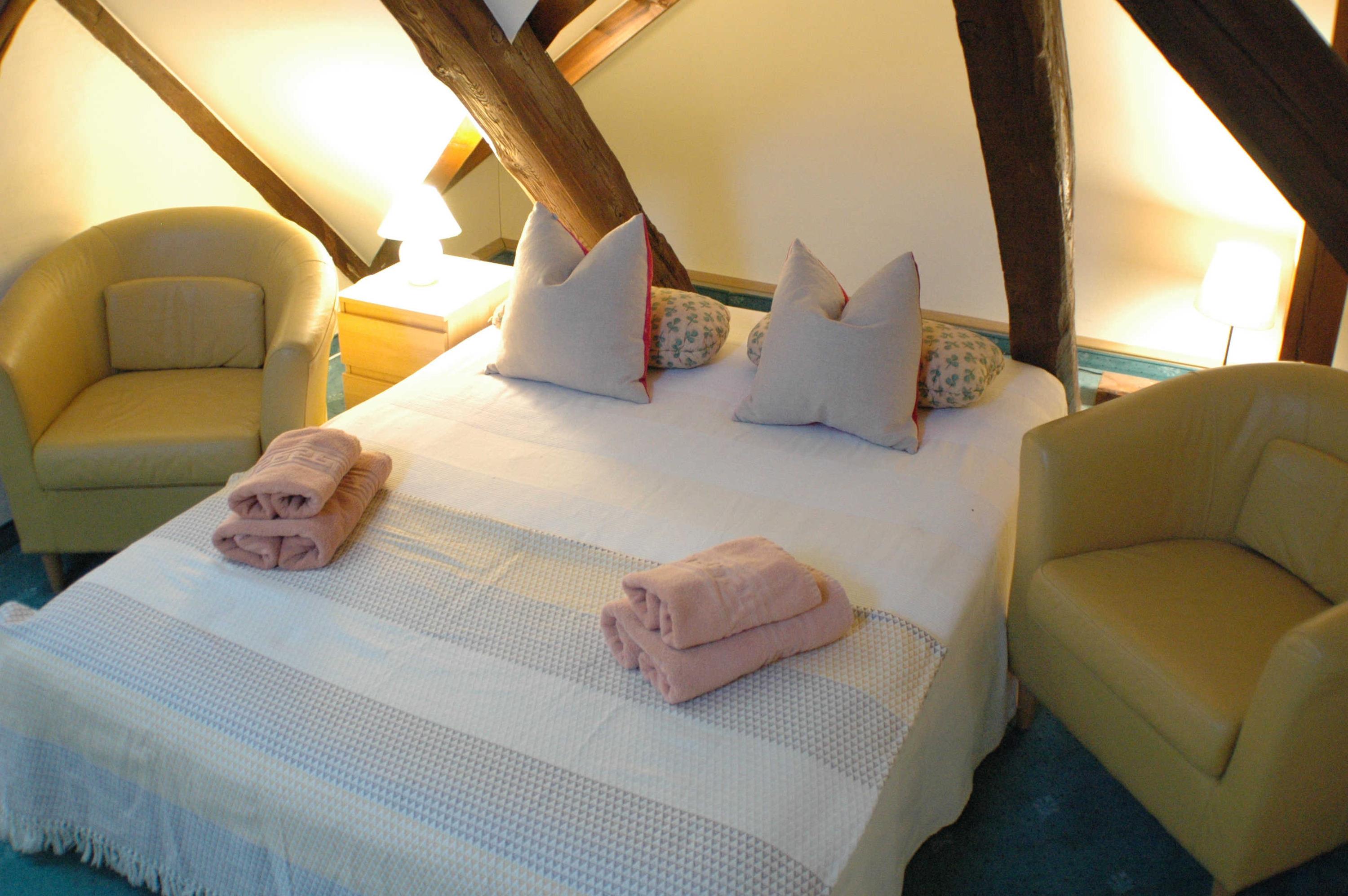 Die Ferienwohnung Schlangenkönig ist auf zwei Etagen verteilt. Im Erdgeschoss befindet sich eine Küchenzeile mit einer kleinen Sitzecke und einem Esstisch für 4 Personen. Die Küche ist ausgestattet mit einem zwei-Platten Induktionsherd, einer Kaffeemaschine, einem Wasserkocher, Toaster und Radio mit CD. Das Wohnzimmer befindet sich im hellen Wintergarten und ist eingerichtet mit gemütlichen Sitzmöbeln, einem Sat-TV und ermöglicht direkten Zugang zur Terrasse. Das erste Schlafzimmer ist offen über die Treppe direkt vom Erdgeschoss aus zu erreichen. Eine Anbauwand sorgt für genügend Stauraum. Angrenzend befindet sich das zweite Schlafzimmer. Es ist eingerichtet mit einem Doppelbett, einer Sitzecke und einem Schrank. Das Badezimmer erreicht man vom Schlafzimmer. Es ist ausgestattet mit einer Dusche, Waschbecken, Toilette, Spiegel und Föhn.