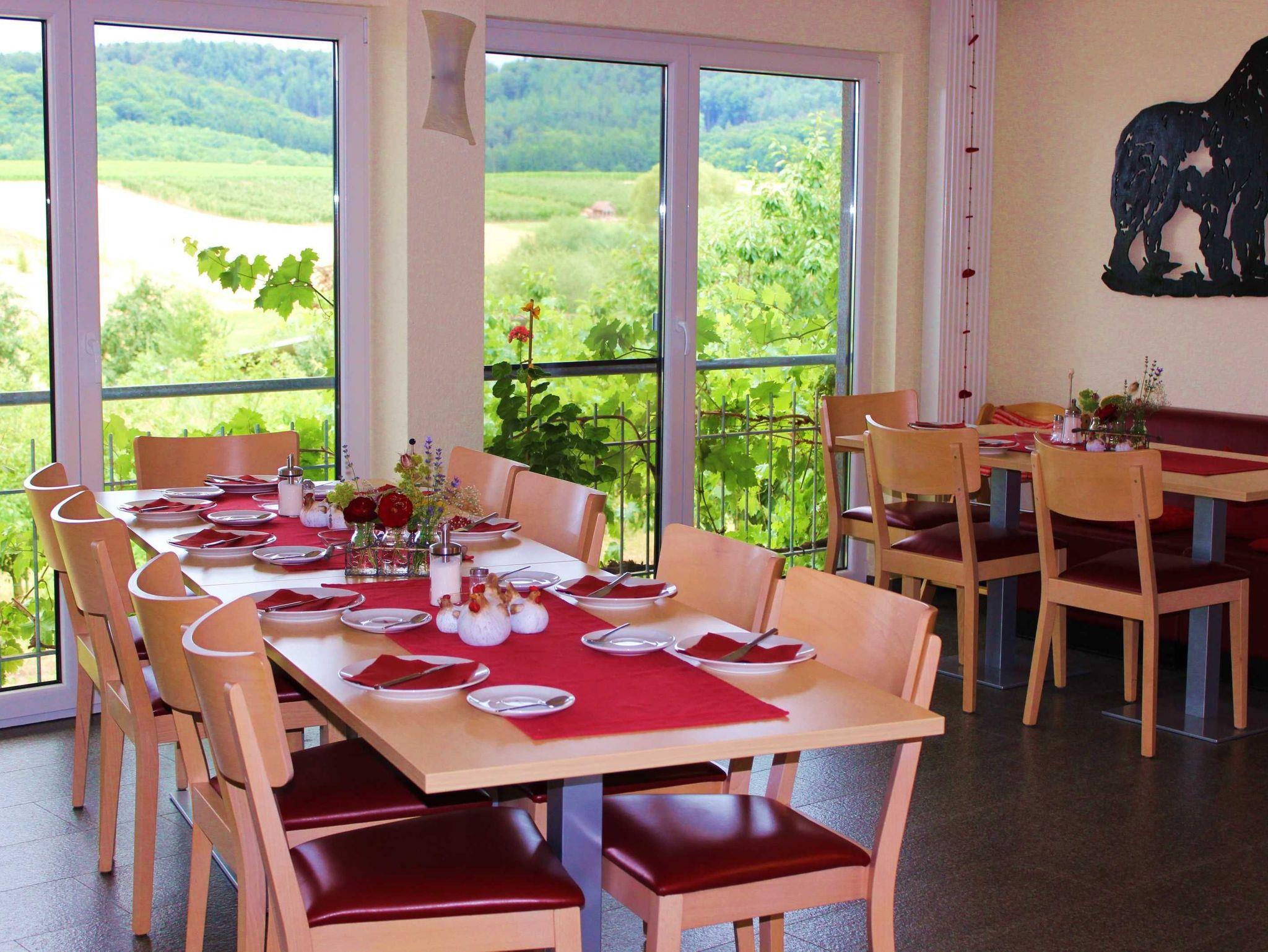Dieses liegt im Erdgeschoss und ist auch für Personen mit körperlichen Einschränkungen gut zu bewohnen. Es ist ausgestattet mit hellen Holzmöbeln, einem Doppelbett, Flat-TV, Schreibtisch, WLAN und einem modernen Bad mit bodenebenen Dusche, WC und Fön. Außerdem verfügt das Zimmer über einen herrlichen Balkon, welcher durch seinen weitläufigen Blick über Wiesen und Weinberge zum gemütlichen Verweilen einlädt.