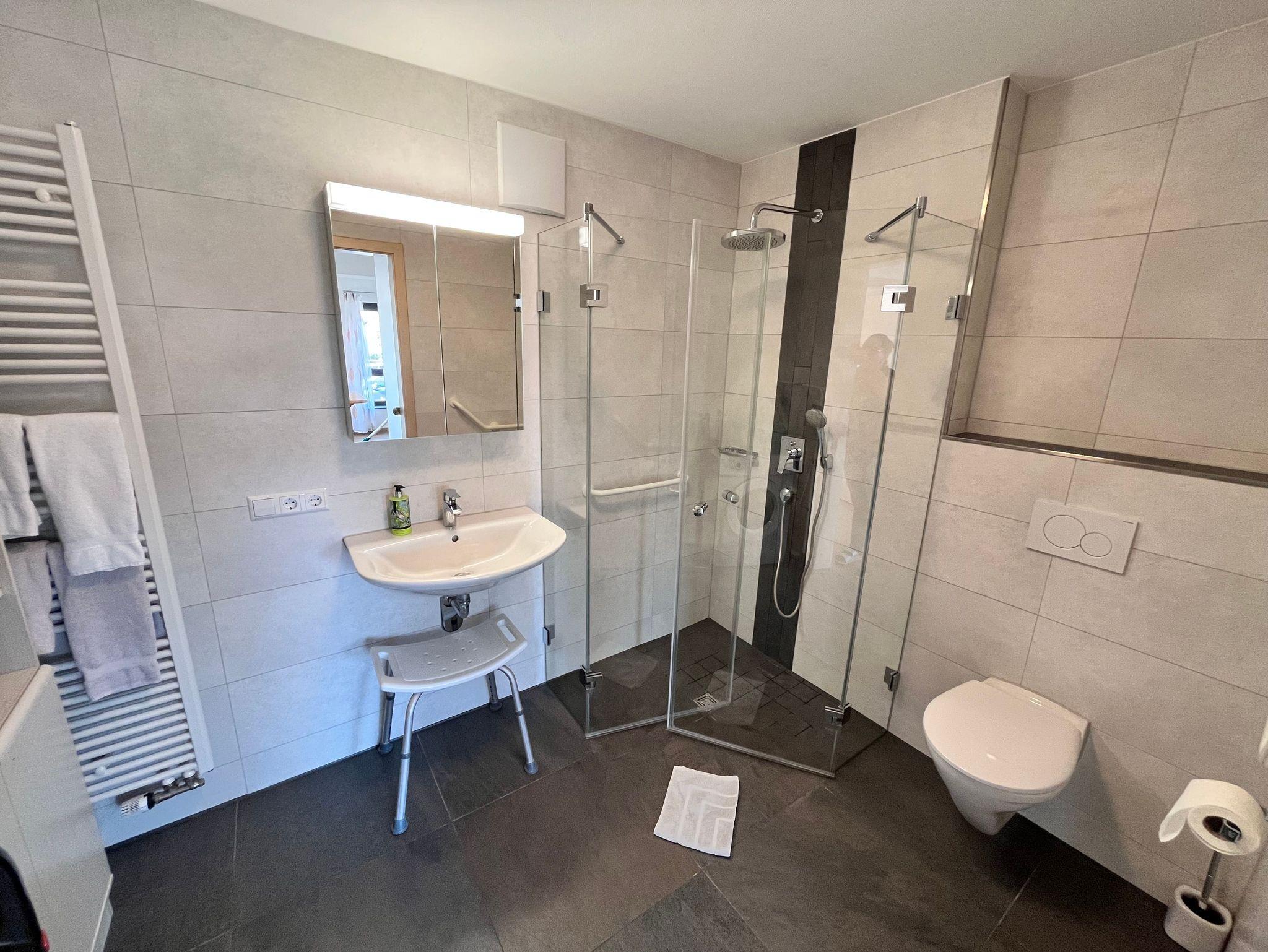 Das moderne, großzügige Badezimmer ist komplett barrierefrei gestaltet. Es verfügt über eine bodengleiche Rainshower-Dusche, Haltegriffe an WC und Dusche, einen Duschhocker sowie eine Waschmaschine.