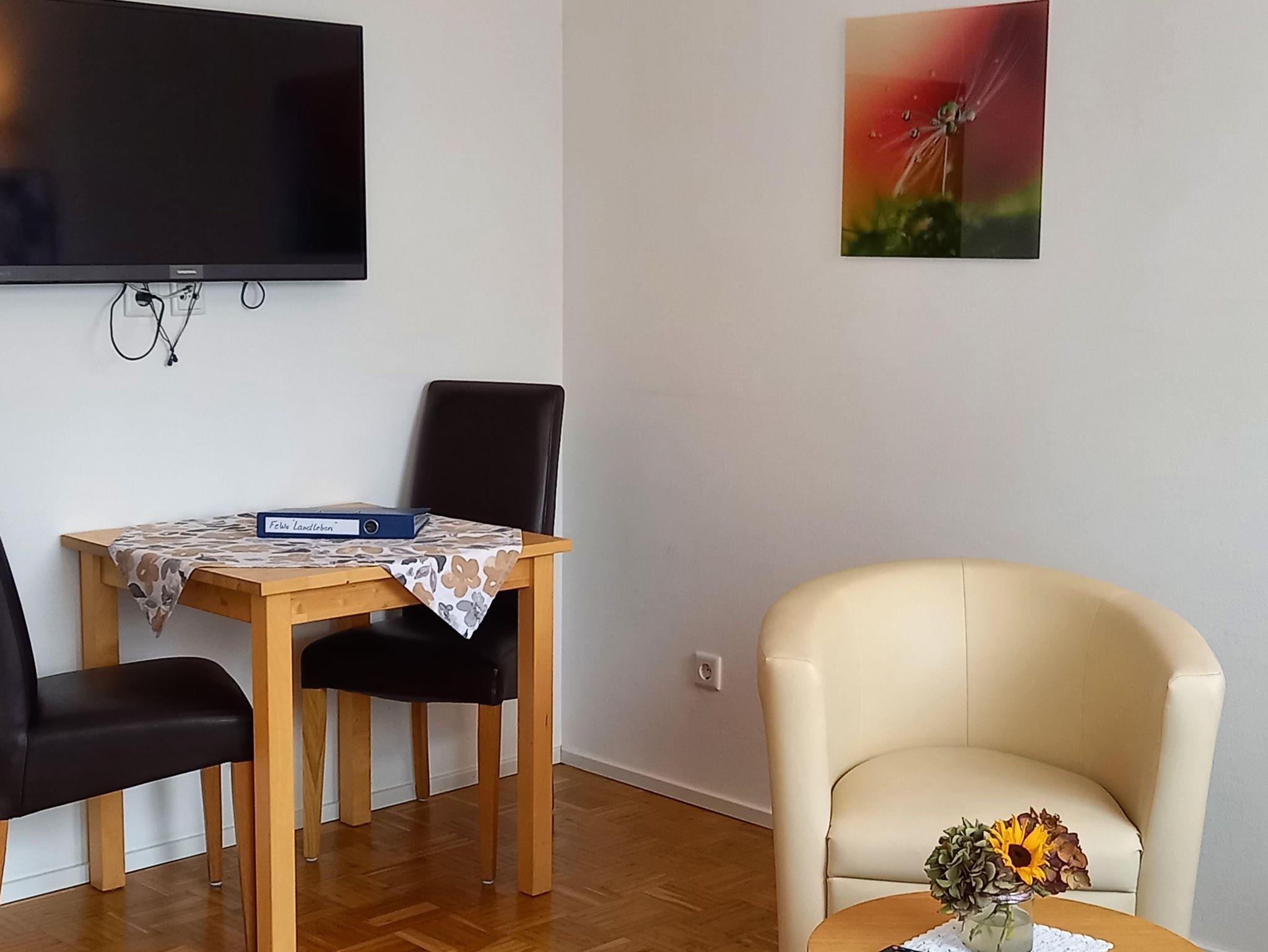 Unsere Ferienwohnung ist ca. 40 m² groß und modern eingerichtet. Der Wohnraum ist mit einem Sofa, Couchtisch, Sessel, Fernseher sowie einem Eßtisch und einer Küchenzeile ausgestattet. Der Balkon hat den Zugang vom Wohnraum aus. Das Schlafzimmer verfügt über einen Kleiderschrank und zwei Einzelbetten und Sie gelangen von dort in das Duschbad. Die Wohnung ist ideal für 2 Personen, aber auch für 2 Erwachsenen mit 1 Kind geeignet. Das Sofa im Wohnraum kann aufgeklappt werden und bietet einen bequemen Schlafplatz. Die Handhabung des Sofas ist sehr einfach, so dass es leicht zum Bett ausgeklappt und tagsüber ebenso leicht wieder zum Sofa werden kann Die Küchenzeile ist mit einem Kühlschrank und einem 2-Platten-Ceranfeld ausgestattet. Außerdem stehen Ihnen 1 Kaffeemaschine, ein Wasserkocher und eine Mikrowelle mit umfassenden Funktionen zur Verfügung. . Bettwäsche und Handtücher sind im Übernachtungspreis enthalten.