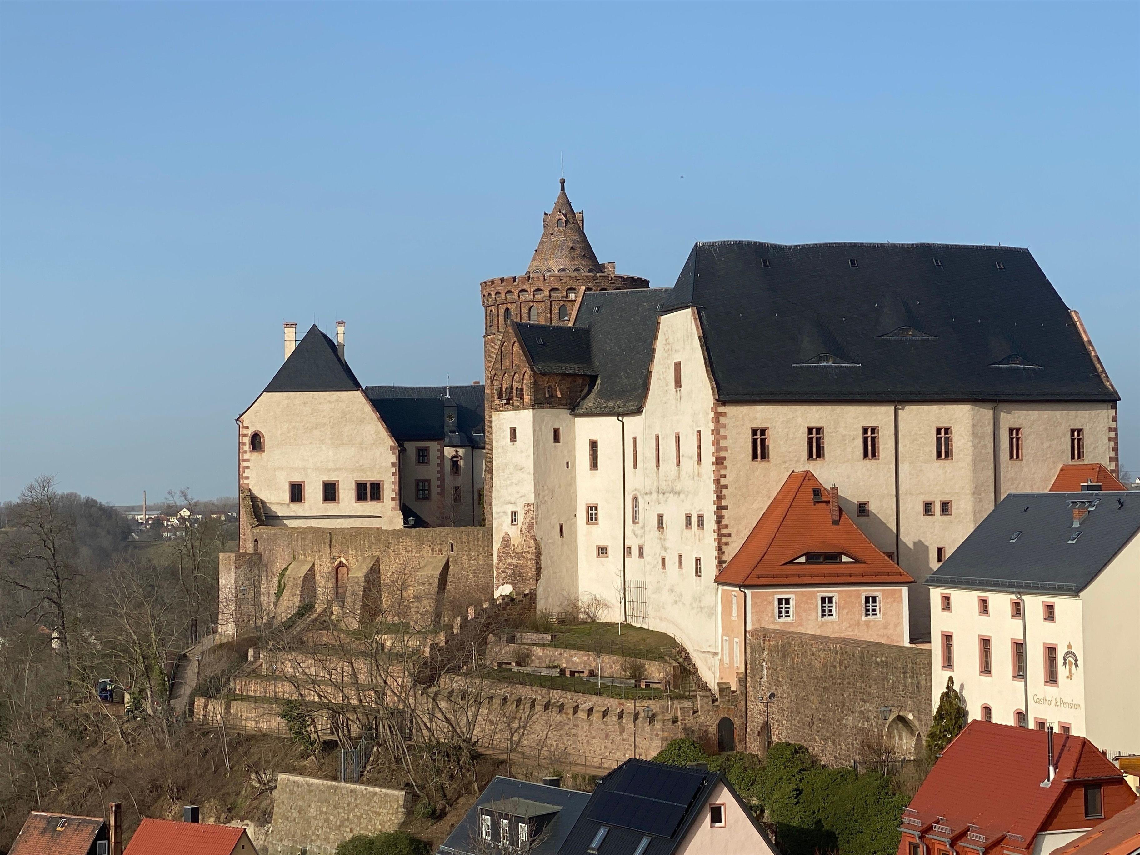 Balkon mit Blick auf die Mulde und Burg Mildenstein
