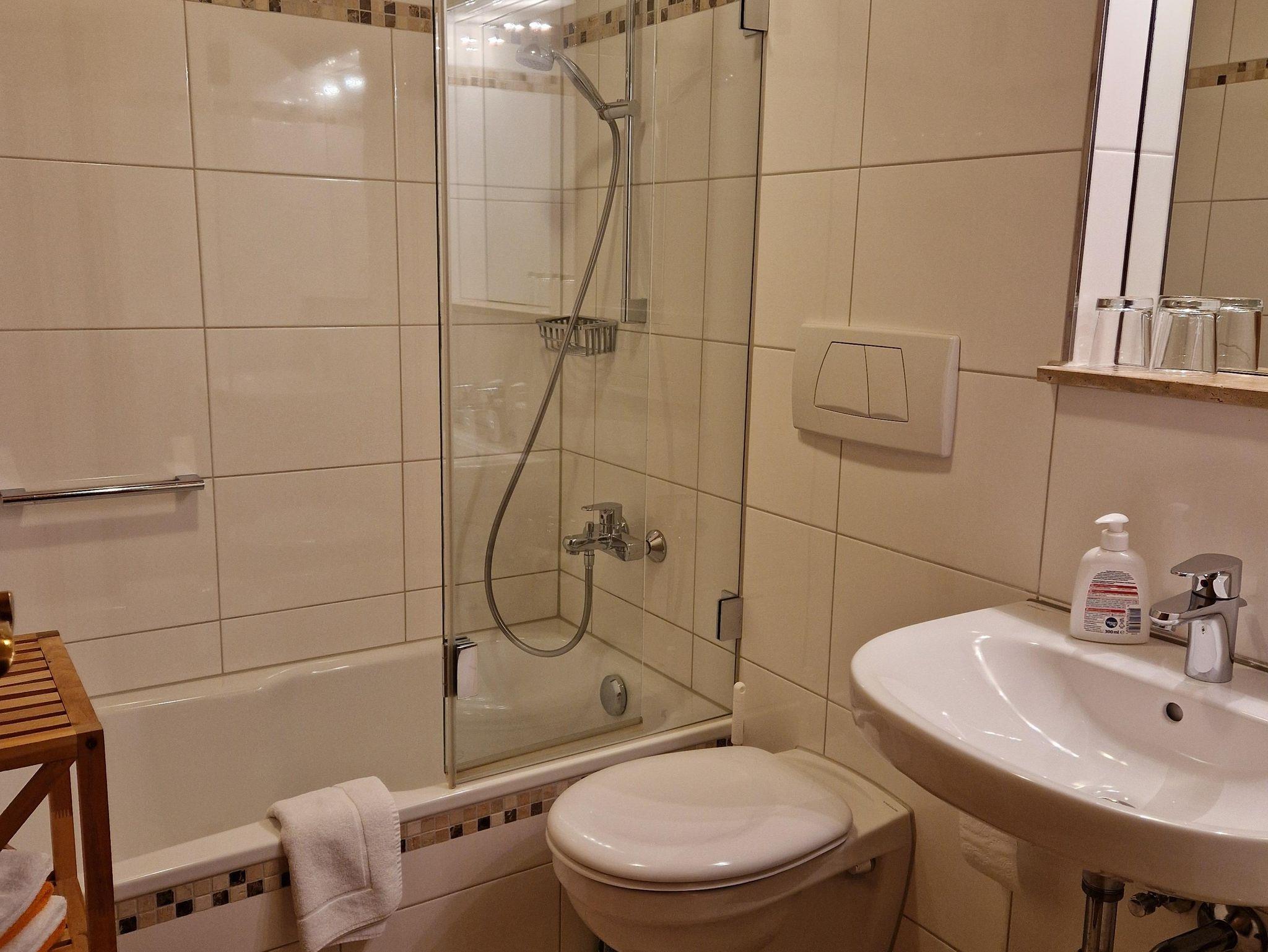 Geräumiges Dreibettzimmer mit Balkon, Bad und WC. Kabel-TV und Gästekühlschrank sind vorhanden. Föhn auf Anfrage. Gemütlicher Aufenthaltsraum mit Teeküche und WLAN-Empfang steht zur freien Verfügung.