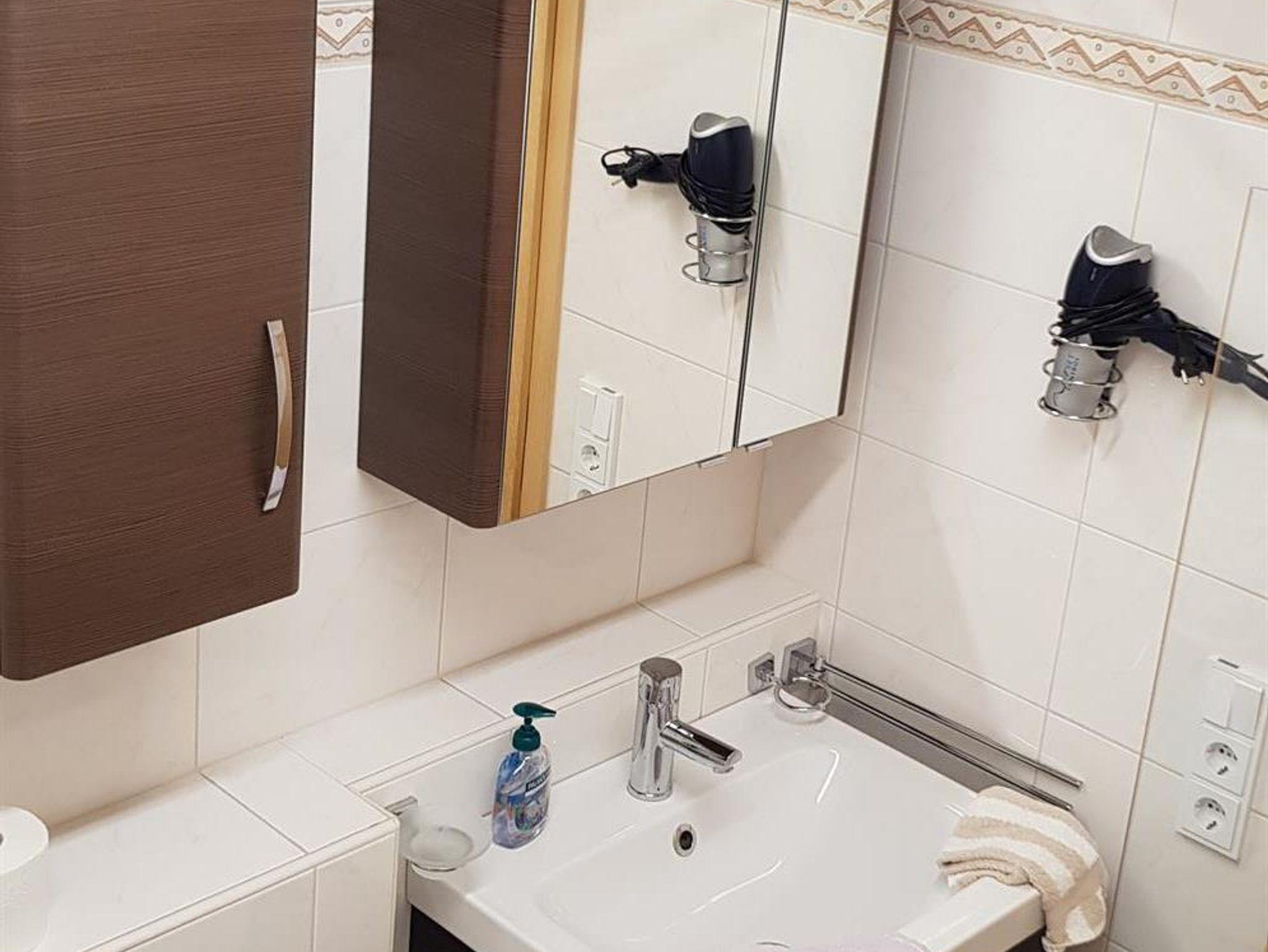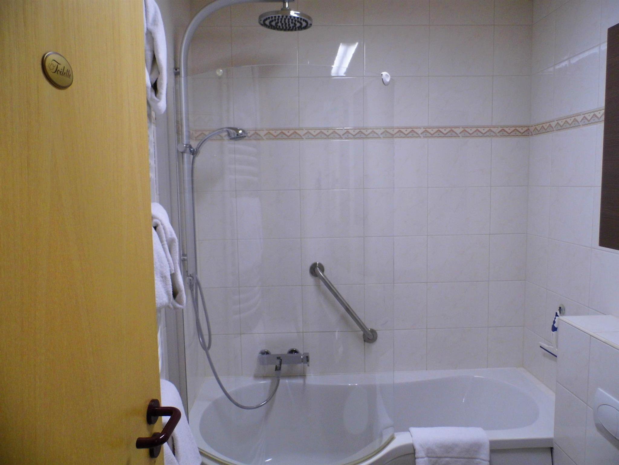 Badezimmer mit WC: Badewannen-Duschkombination, Handtuchheizkörper, Fön.