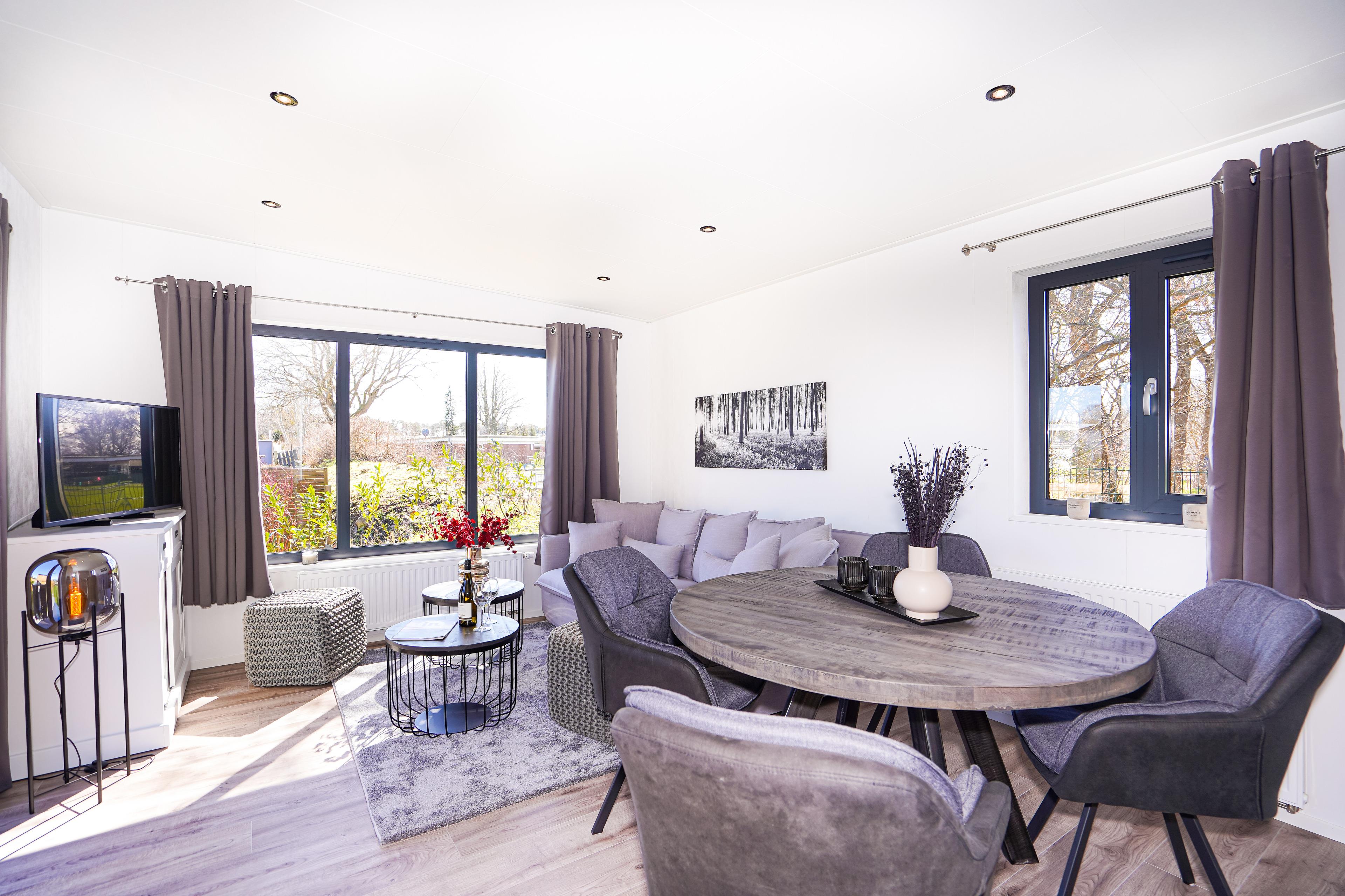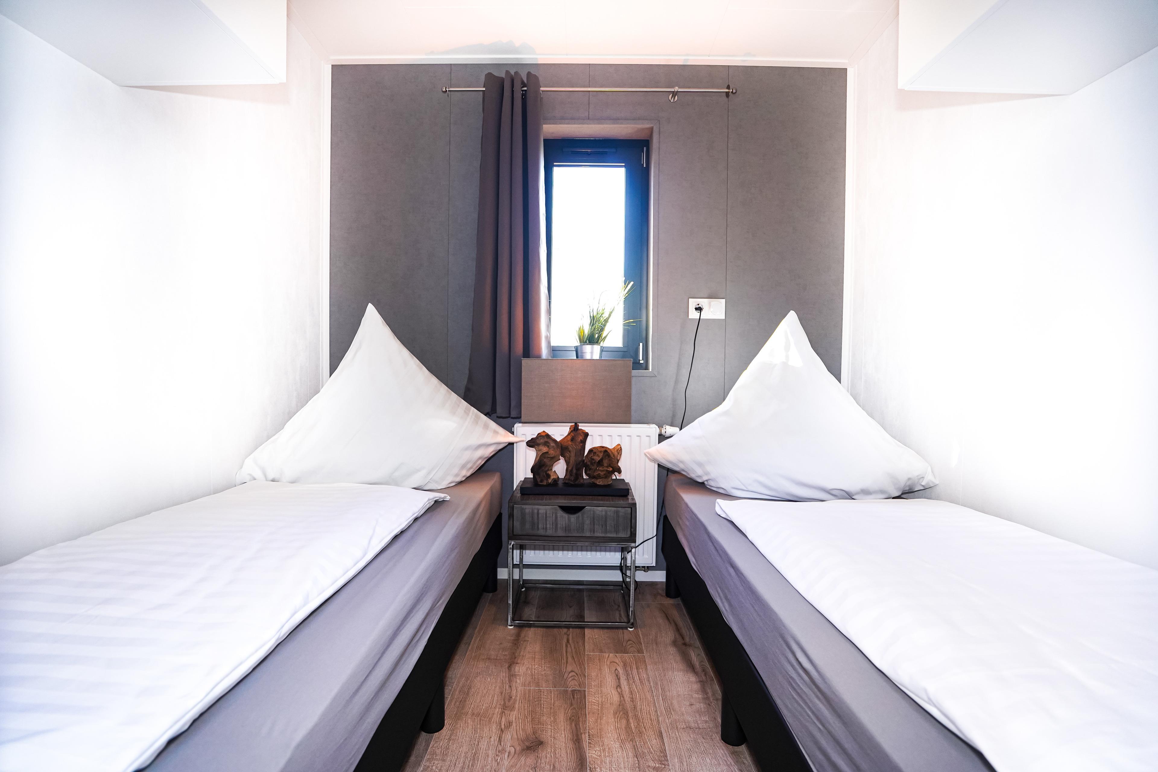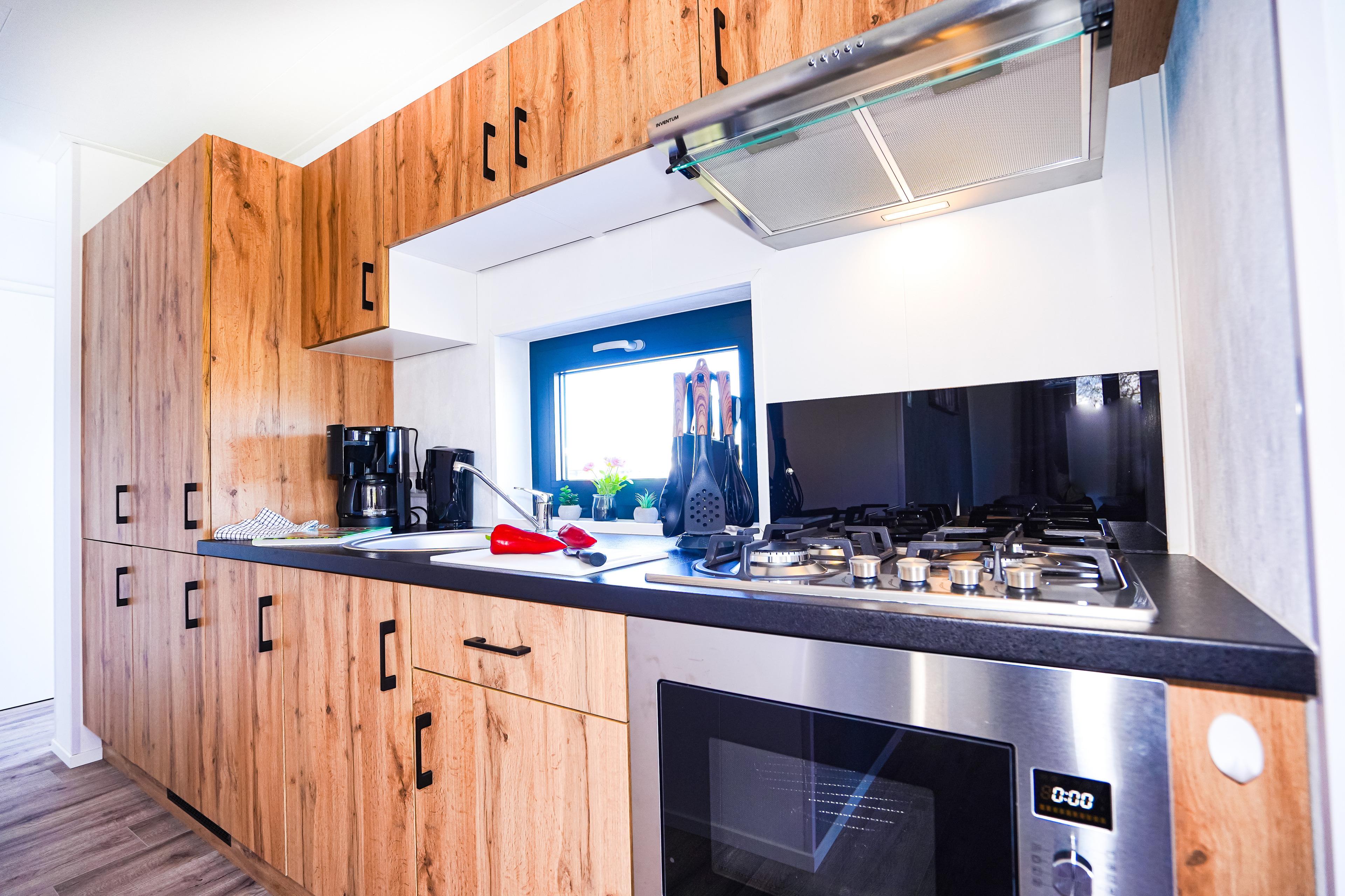 Diese gemütlichen Unterkünfte bieten Platz für bis zu 4 Personen und sind perfekt für einen entspannten Urlaub. Jedes Mobilheim verfügt über eine voll ausgestattete Küche mit Gasherd und Mikrowelle, Kühl- und Gefrierkombination, Geschirrspüler, Kaffeemaschine und Wasserkocher. Ein modernes Badezimmer mit Dusche, WC und Waschtisch sowie zwei einladende Schlafzimmer (ein Doppelbett 2x80x200cm und zwei Einzelbetten 80x200cm) sorgen für Ihren Komfort.