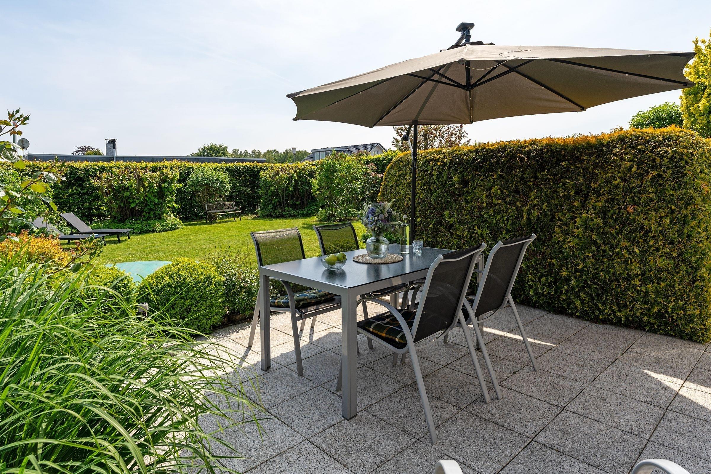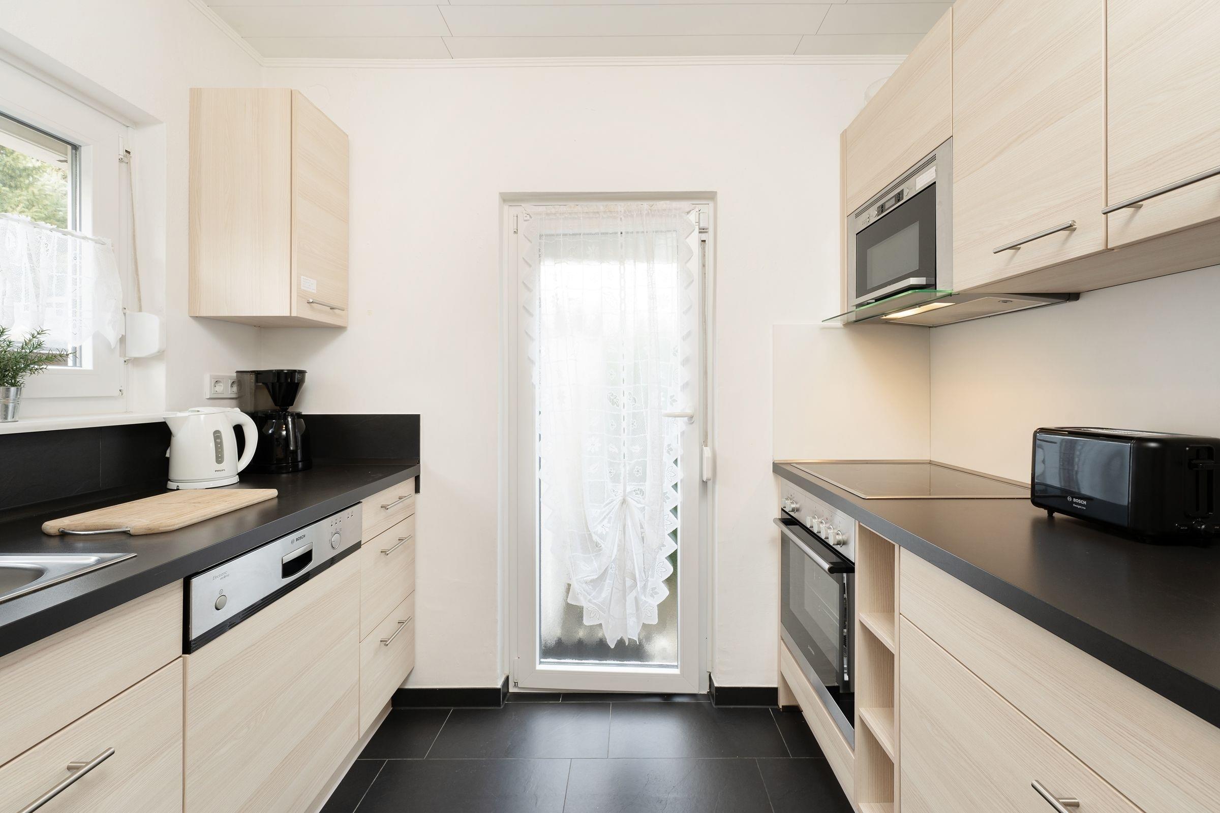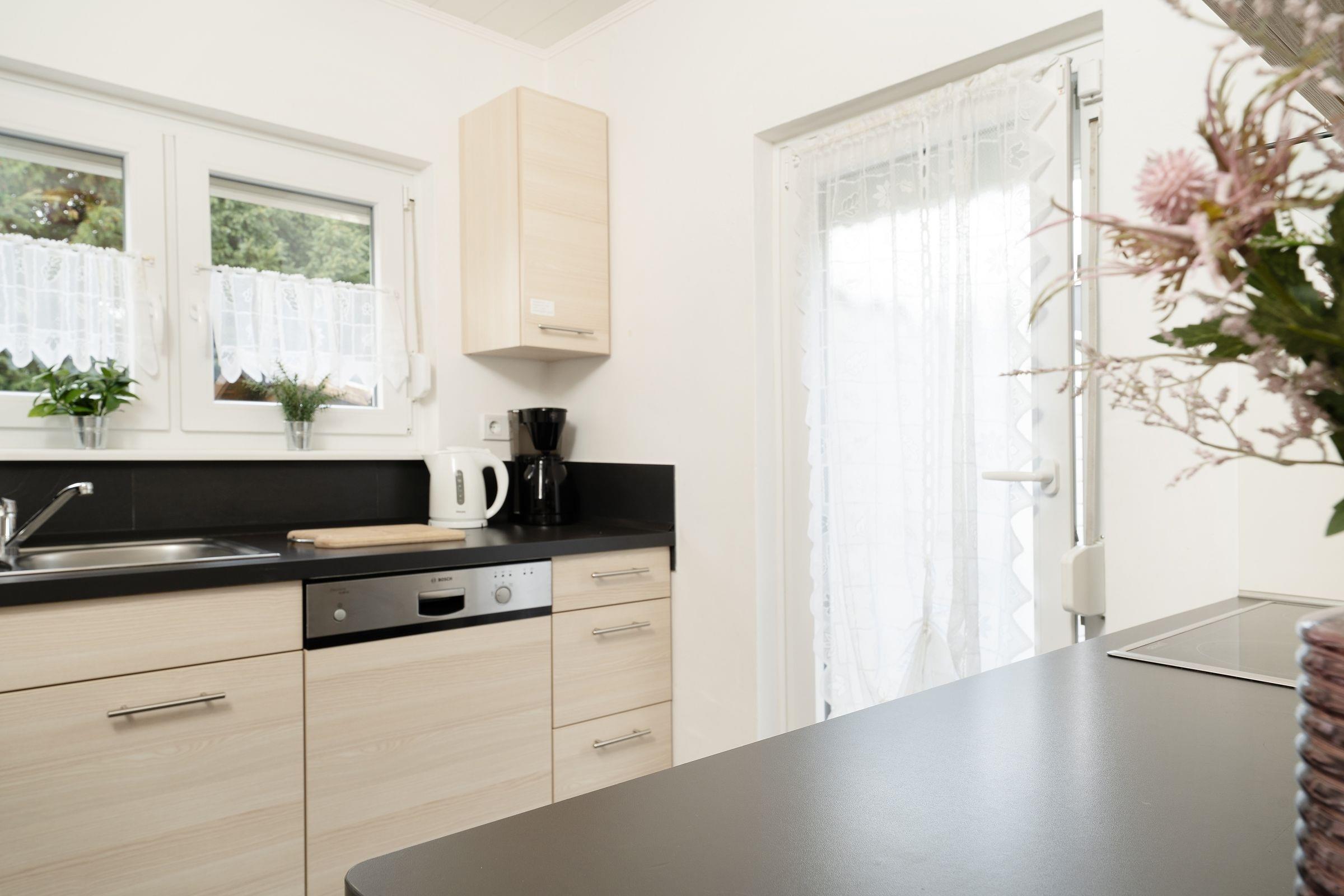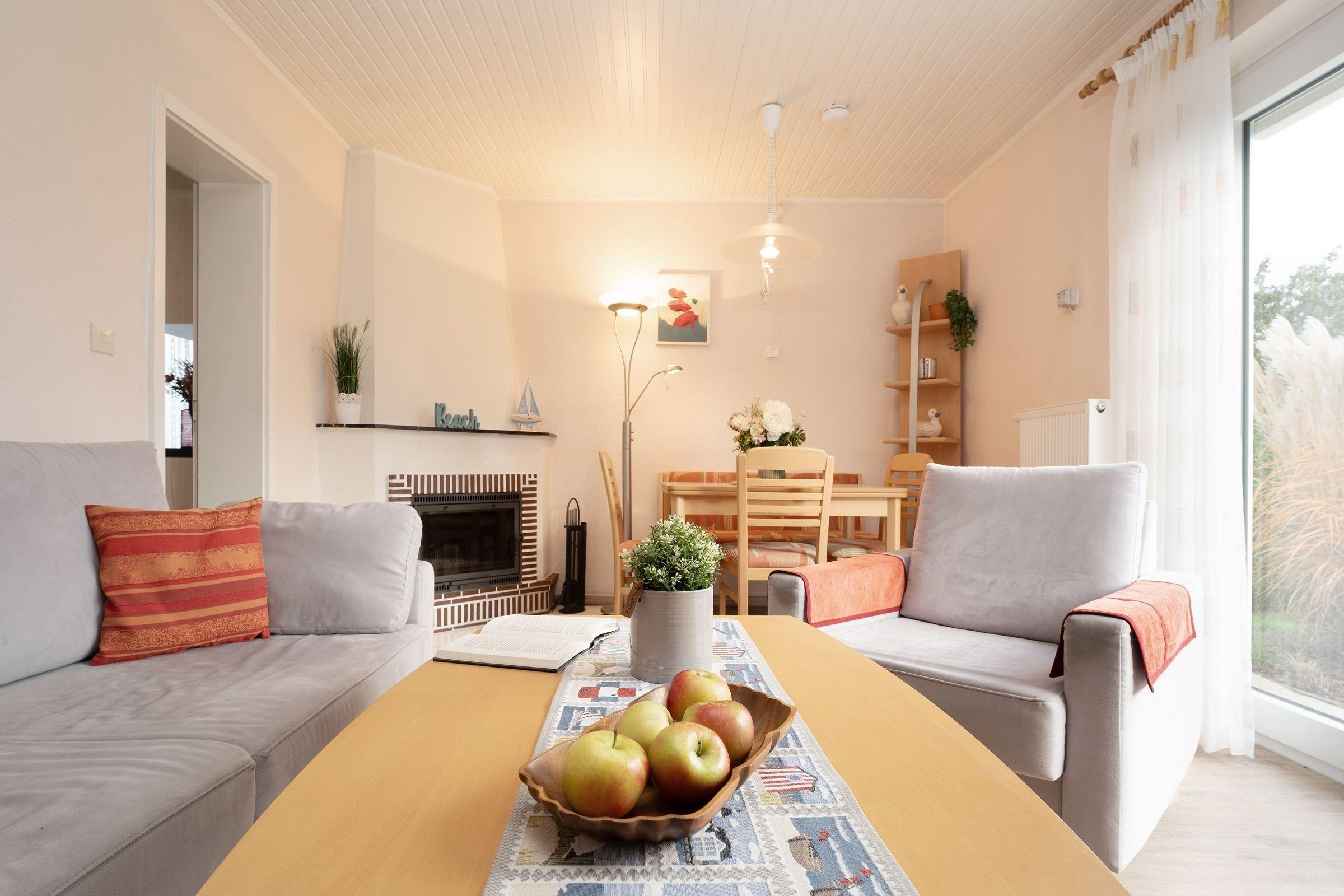 Machen Sie es sich in der komfortablen Sofaecke (Liegemaße 160x200 cm) mit Sessel und TV gemütlich. Der Kamin sorgt zusätzlich zur Zentralheizung auch an Regentagen für wohlige Wärme. Vom lichtdurchfluteten Wohnzimmer führt ein direkter Zugang auf die Terrasse und in den malerischen Garten. Genießen Sie Ruhe und Entspannung im separaten Schlafzimmer mit komfortablem Doppelbett von traumhaften Abmessungen (2x 100x200 cm) und geräumigem Kleiderschrank für Ihre Urlaubsgarderobe. Hier werden Sie wie auf Wolken schlafen. Das zweite separate Schlafzimmer bietet mit einem Einzelbett (90x200 cm) und einem Etagenbett (2x 90x190 cm) ausreichend Platz und Freiraum für bis zu 3 Kinder. Die separate Küche ist toll ausgestattet, sodass Ihrem selbst kreierten Urlaubsdinner nichts im Wege steht. Hier finden sich Alltagshelfer wie Cerankochfeld, Spülmaschine, Mikrowelle und Backofen. Das schöne Tageslichtbad überzeugt mit Annehmlichkeiten wie Dusche, WC, Waschmaschine und praktischer Handtuchheizung.