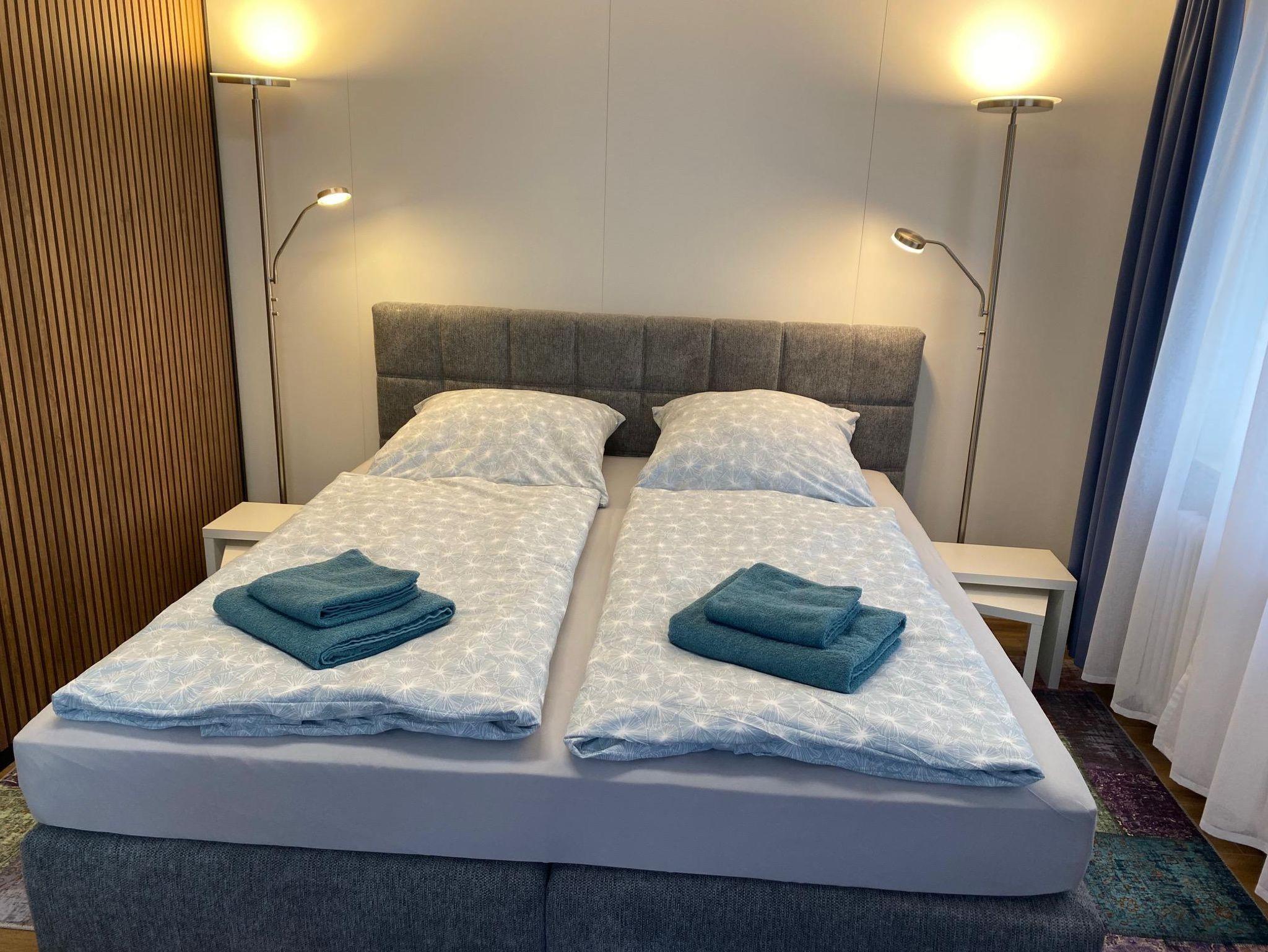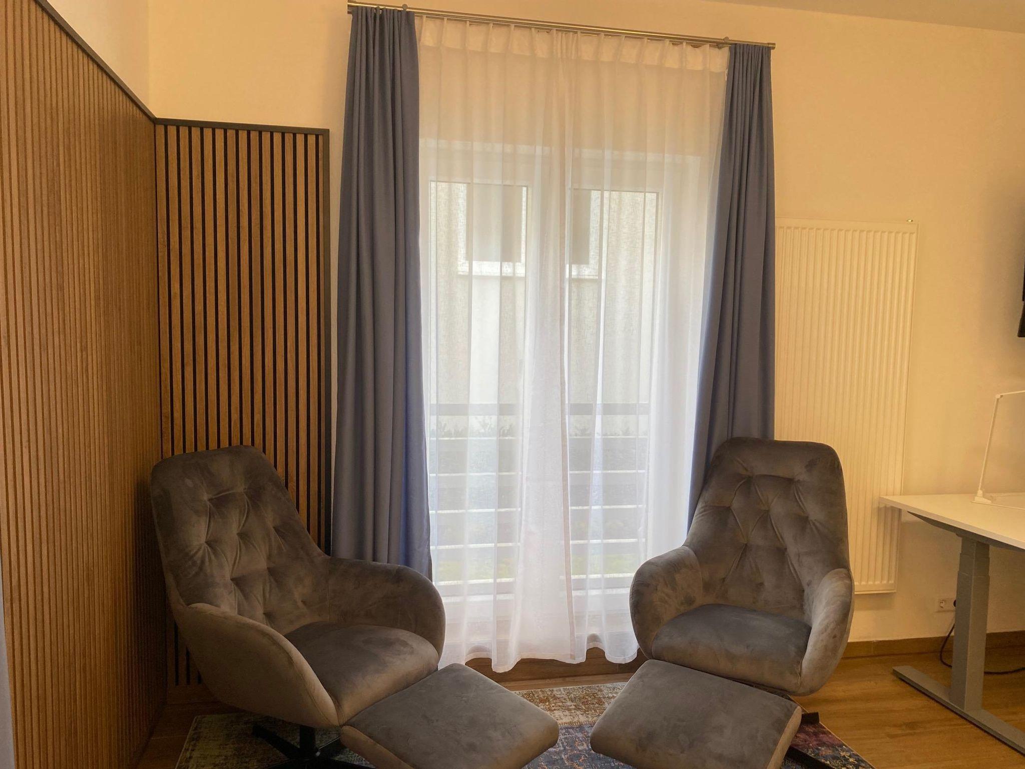 Das neu möblierte Doppelzimmer verfügt über ein Boxspringbett (1,80 m x 2,0 m), einen Kleiderschrank, zwei bequeme Sessel, einen höhenverstellbaren Arbeitsplatz mit Flat Screen sowie einen 55-Zoll-TV. Der Bodenbelag besteht aus Fliesen in Holzoptik und Teppichen.