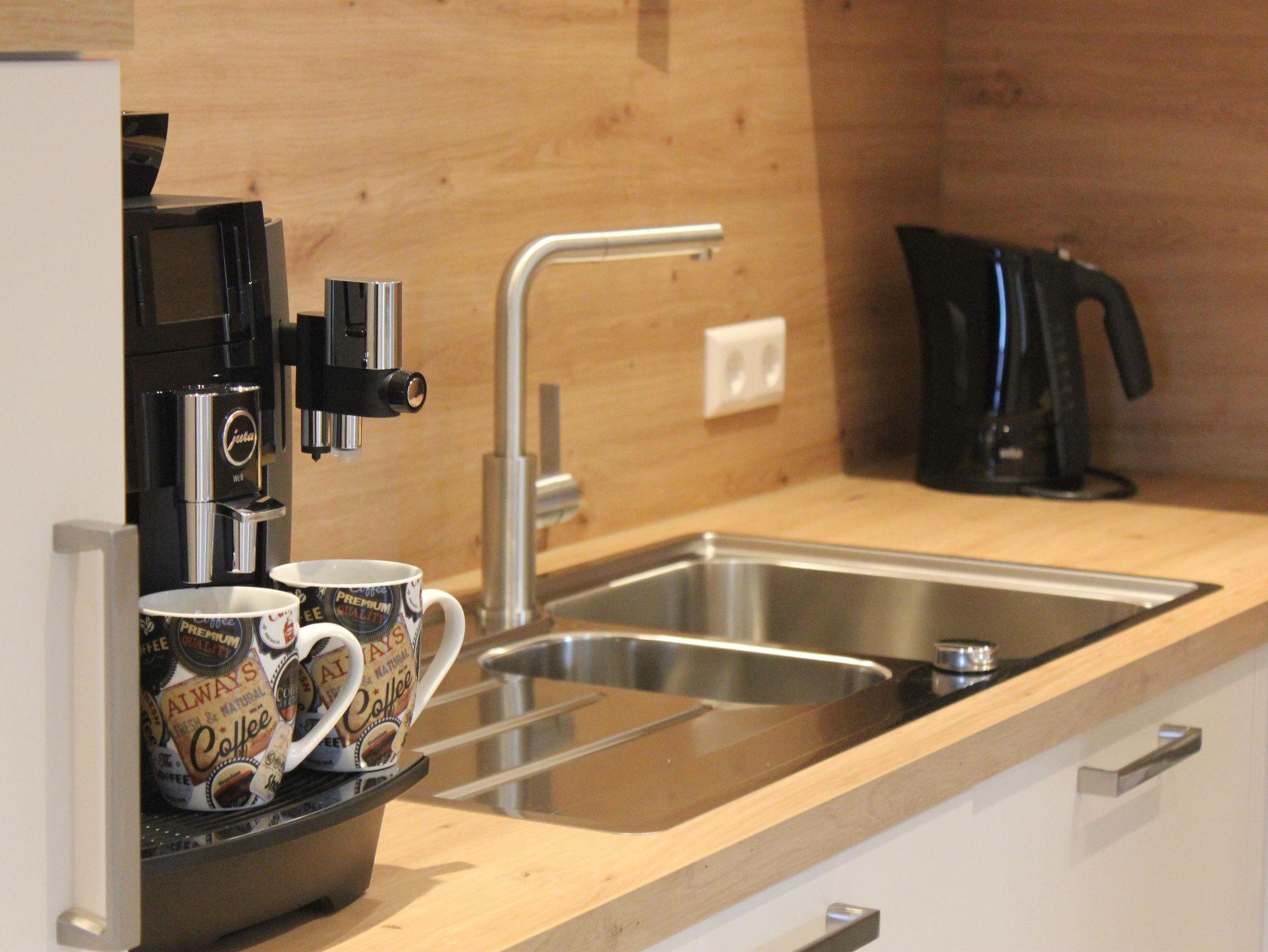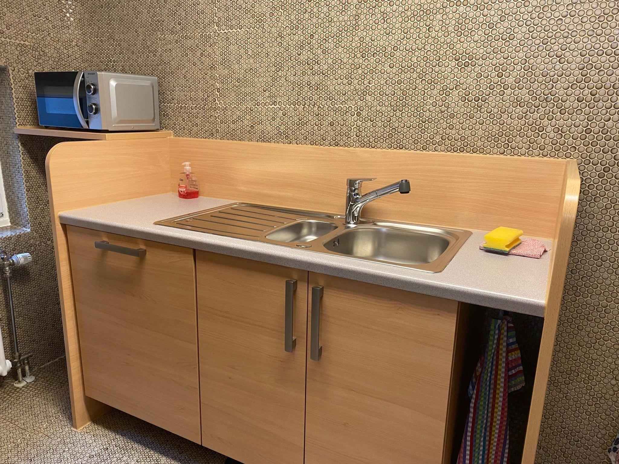 Das Wohn-/ Esszimmer enthält eine voll ausgestattete Küche mit Elektrogeräten (Kochfeld, Backofen, Kühlschrank, Geschirrspülmaschine, Mikrowelle,Kaffeemaschine, Wasserkocher). Spüle und Dusche liegen im angrenzenden Raum. Das WC mit Waschbecken, Waschmaschine und Wäschetrockner ist über einen kurzen Flur erreichbar.