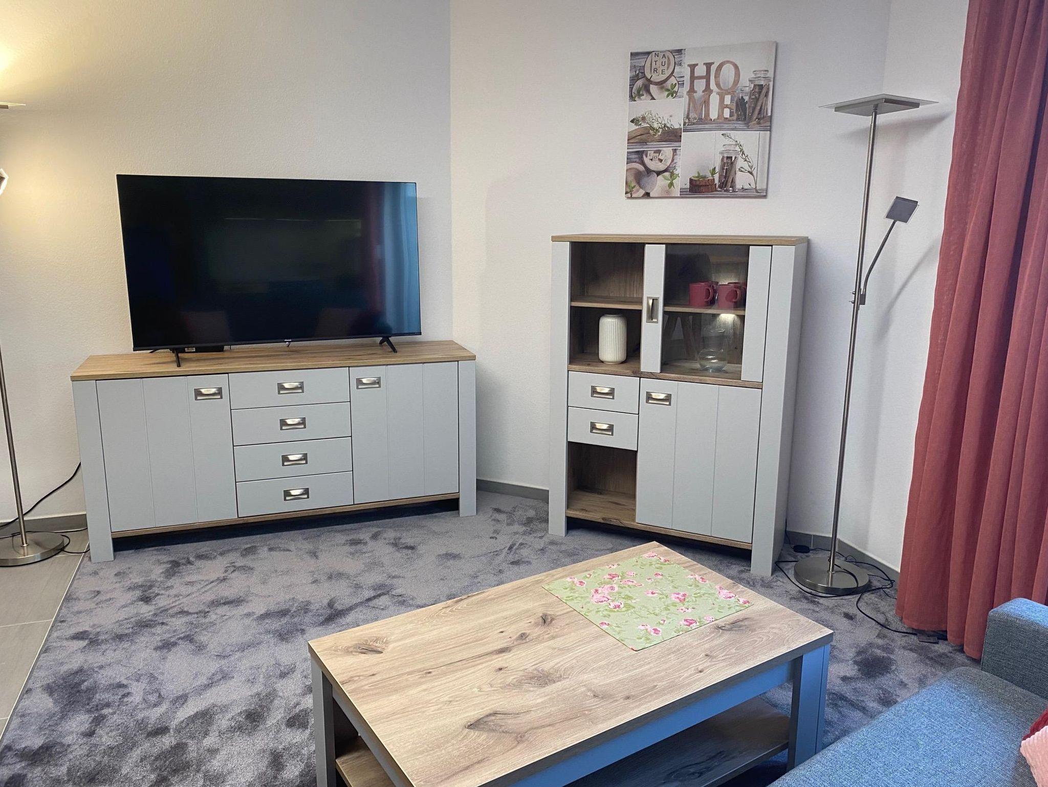 Das Appartement (58 m²) mit meist neuen Möbeln verfügt über ein Schlafzimmer mit Boxspringbett und ein bequemes Schlafsofa im Wohnbereich. Der Bodenbelag besteht aus Fliesen und Teppichen.