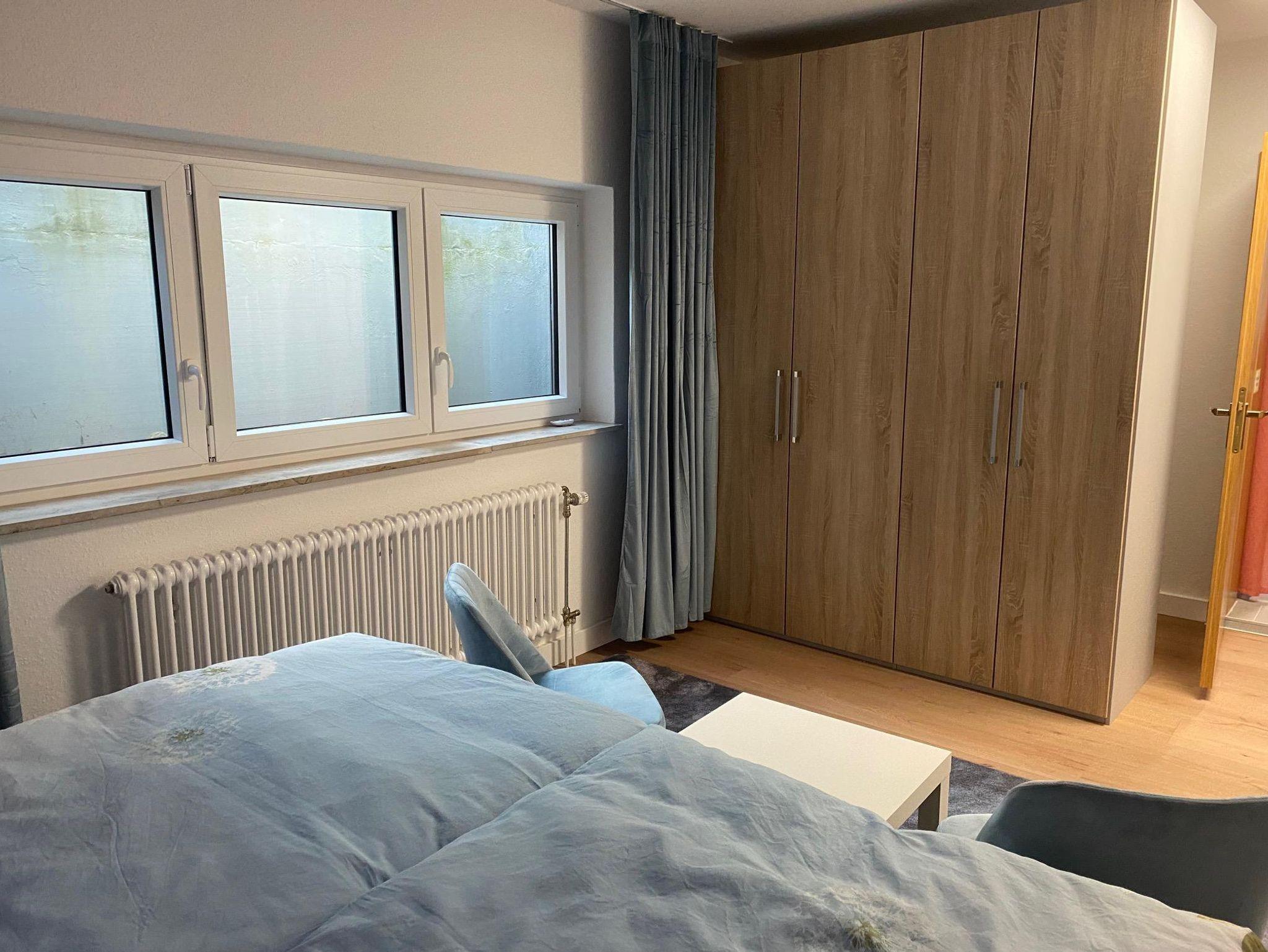 Das Appartement mit Lichthof liegt im Gartengeschoss. Im Preis enthalten sind: Reinigung, Bettwäsche/Handtücher, TV, Internet/WLAN, Kopierer/Scanner/Drucker, Waschmaschine, Wäschetrockner, Kaffeemaschine, Haarfön, Wasserkocher, Schreibtisch mit Bürostuhl und Stellplatz.