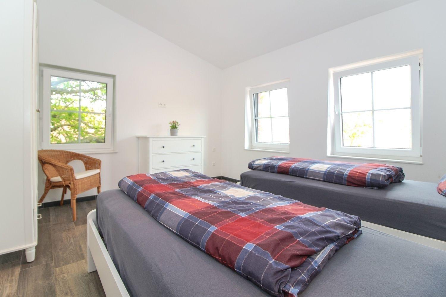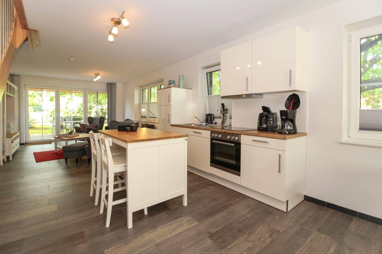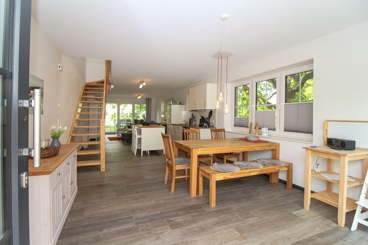 Die Ferienwohnung Zum Stall befindet sich in einem Gebäudekomplex mit 3 Wohnungen und wurde im Februar 2020 fertig gestellt. Das sehr hochwertig eingerichtete Ferienobjekt läßt keine Wünsche offen. Große Fensterfronten am Eingang und an der Terrassenseite sorgen für ein helles und freundliches Ambiente. Im Paterre haben Sie eine offene moderne vollausgestattete Küche. Hier lassen sich leckere Speisen zubereiten, die dann am Esstisch nebenan verspeist werden können. Im Wohnbereich befindet sich eine moderne Couchgarnitur, die zu gemütlichen Abenden/Fernsehabenden mit Flachbild TV einlädt. Von hier aus haben Sie einen freien Blick in den Garten mit einer Liegewiese. Die Schlafräume befinden sich im Obergeschoss, ein Schlafzimmer mit Doppelbett (180 x 2 m, großes Laken erforderlich), Kleiderschrank und Flachbild TV und ein Schlafzimmer mit zwei Einzelbetten. Die Fenster lassen sich per elektrischer Jalousien verdunkeln. Der Blick aus dem Fenster ist traumhaft. Auch auf der möblierten Terrasse genießen Sie die frische Luft und die Sonnenstrahlen. Der weite Blick über die Felder komplettieren Ihren Erholungsurlaub. Ihr Hund ist hier herzlich willkommen und wird mit einem Leckerli begrüßt! Das neu erbaute Gebäude stammt wurde in etwa nach der alten historischen Dorfschmiede Prahst gebaut. Zum Gebäude gehört ein 1000 qm großes Grundstück. Im angrenzenden Fahrradschuppen können mitgebrachte Fahrräder untergebracht werden. WLAN ist verfügbar!