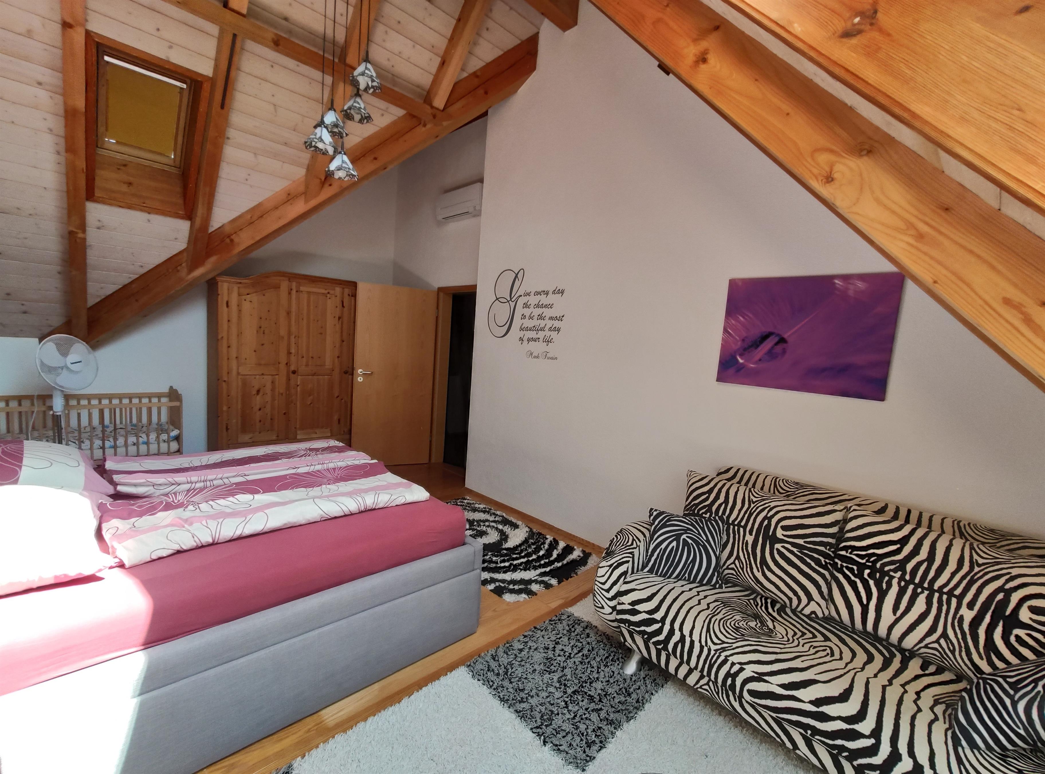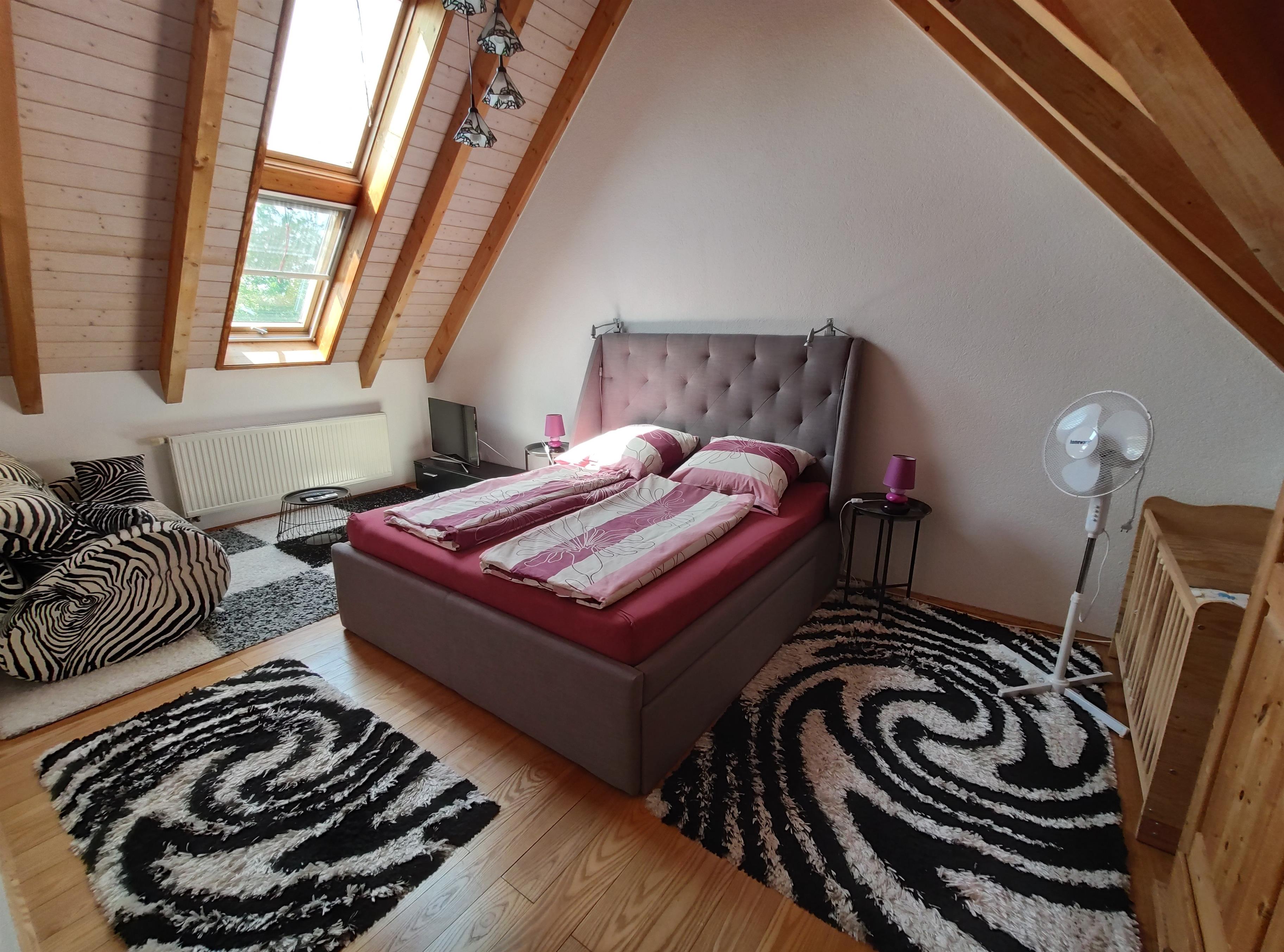 • Zimmer 3 (Lila Zimmer) Mit einem Boxspringbett 180x200cm, Fernseher und Sofa (auch als Zusatzbett), Babybett