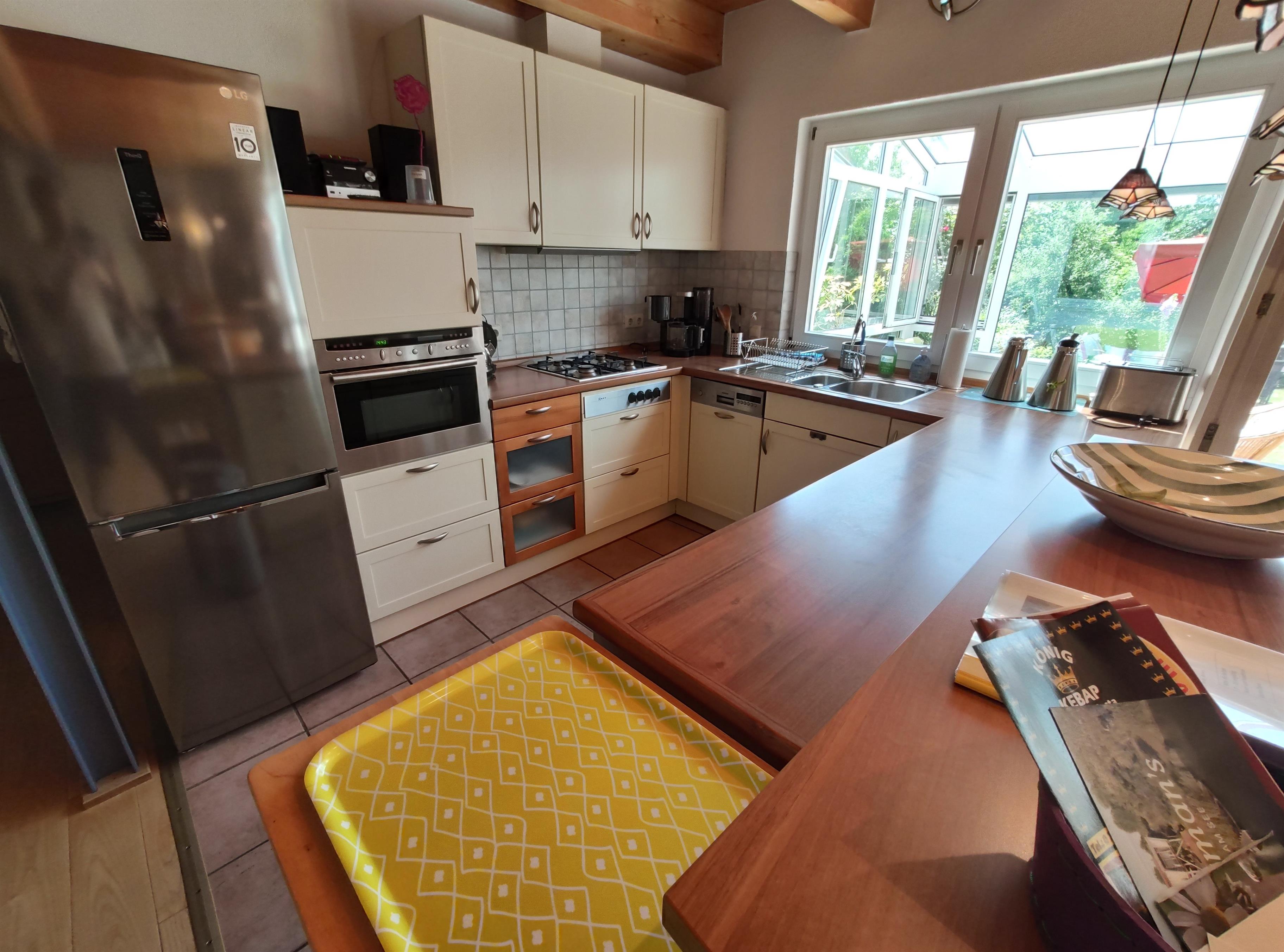 Geschirrspüler, Mikrowelle, Backofen, Kühlschrank, Gas-Kochfeld, Kaffee-Maschine, Wasserkocher, Geschirr, Gläser, Töpfe, Küchenwäsche, Handtücher
