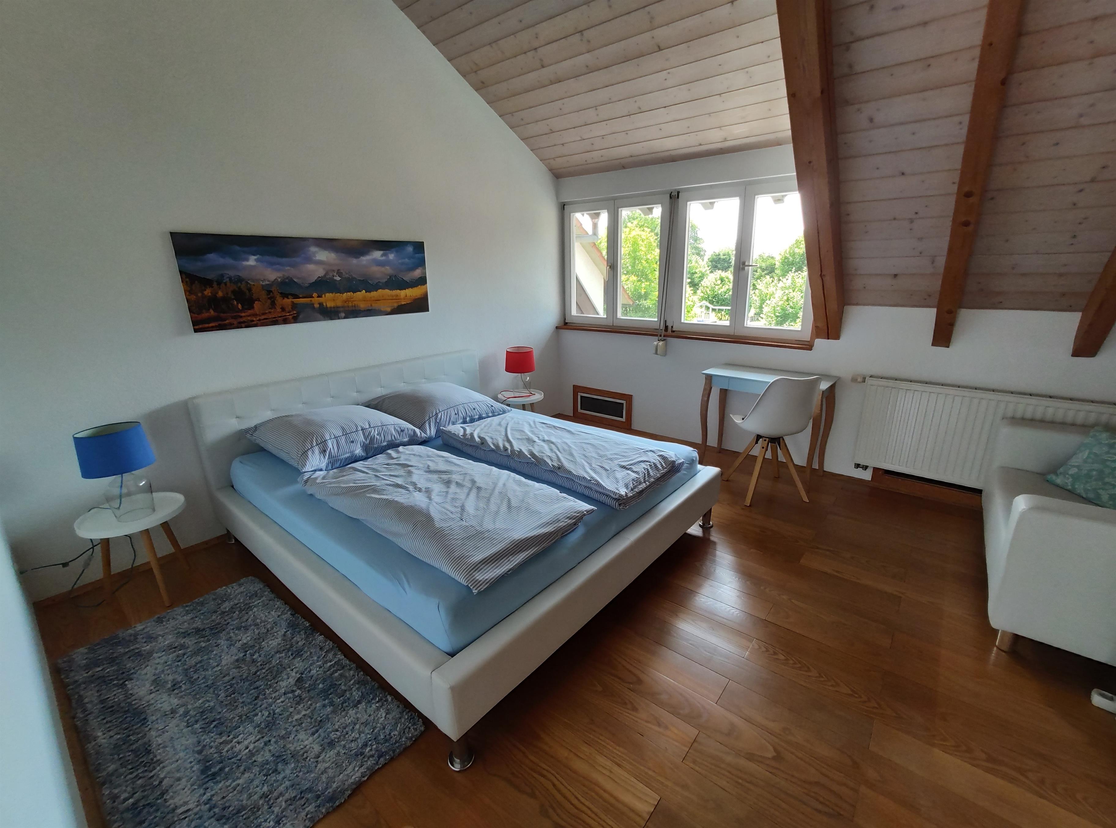 • Zimmer 1 (Blaues Zimmer) Mit einem Doppelbett 180x200cm, großem Kleiderschrank, Schubladenschrank und einem Schreibtisch