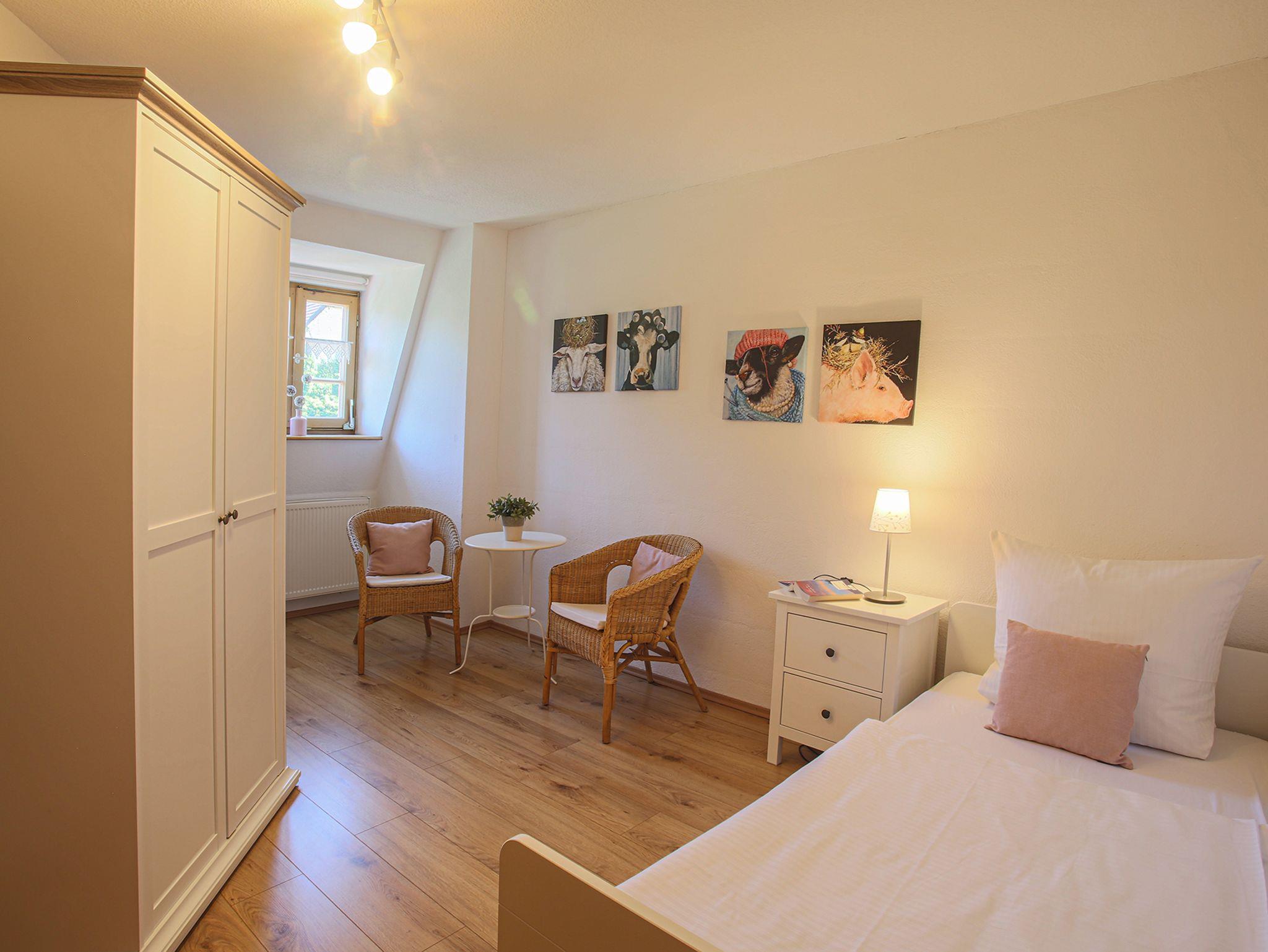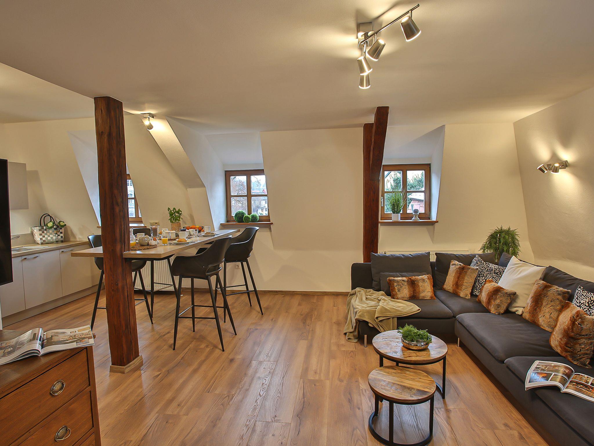 Ökonomiehof, Ferienwohnung Blauer Turm mit gemütlicher Essecke und sofa