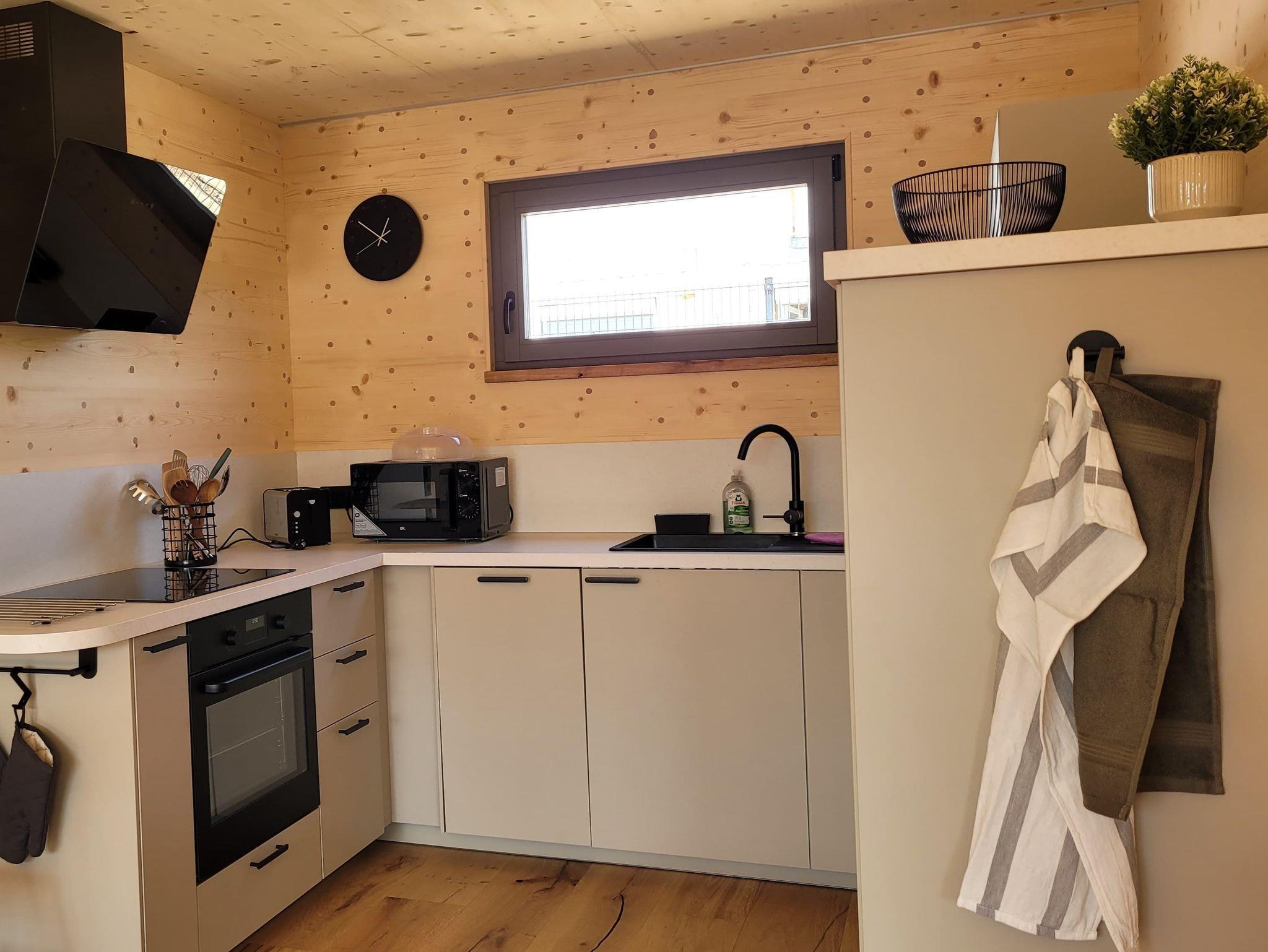 Küche: Komplettausstattung mit Geschirr, Töpfen, Pfannen etc,o Kühlschrank, Tiefkühlfach, Backofen, Geschirrtuch, Schwamm, Spülmittel, Kaffeemaschine, Wasserkocher, Toaster, Käsereibe, Flaschenöffner, Mikrowelle, Geschirrspüler inkl. Reinigungsmittel