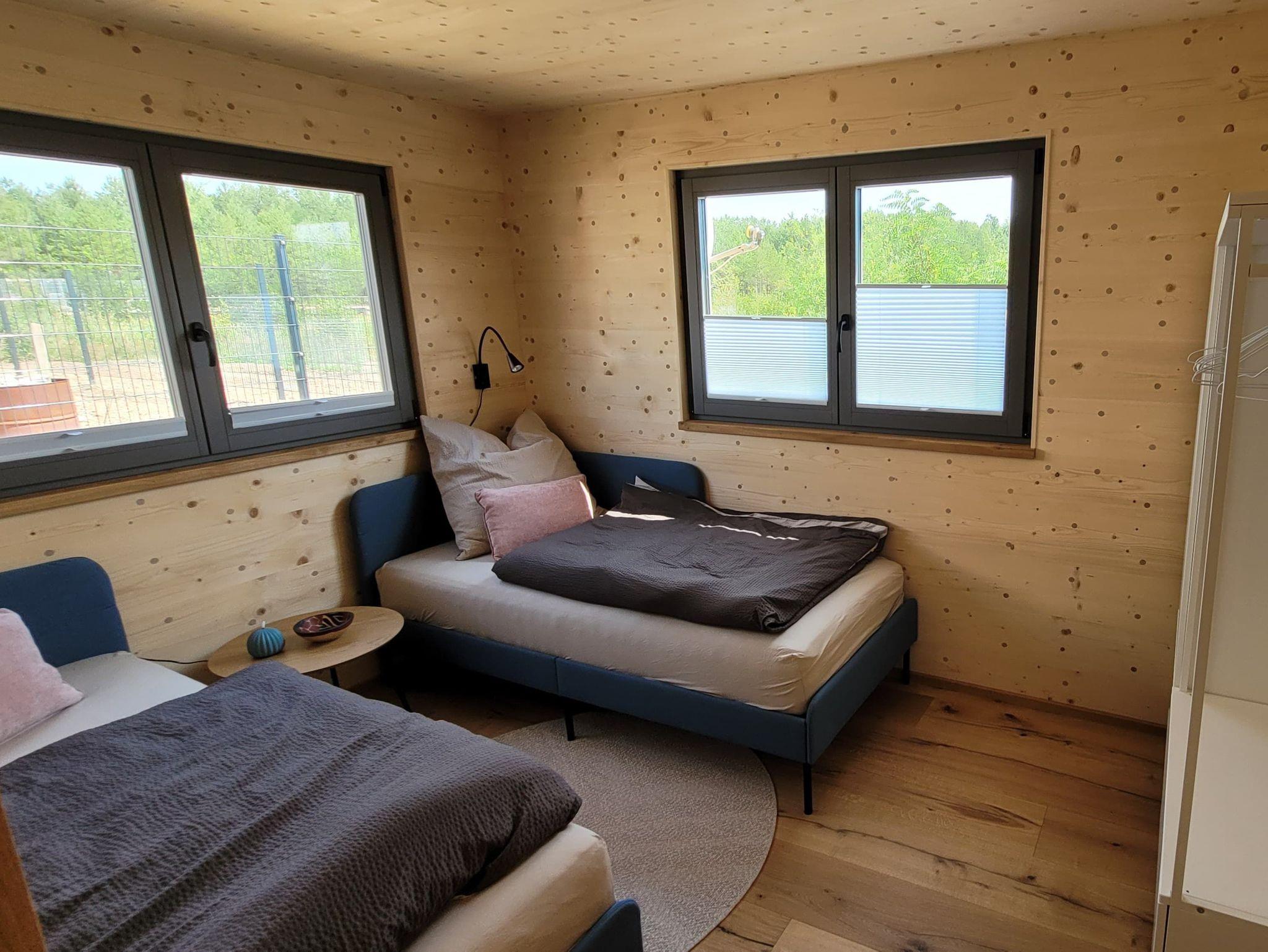 Das ökologische Holzhaus überzeugt mit einer liebevoll gestalteten, gemütlichen Einrichtung, die eine warme Wohlfühlatmosphäre schafft ideal zum Entspannen und Abschalten. Die nach Süden ausgerichtete Terrasse lädt mit einem Tisch und bequemen Stühlen zu erholsamen Stunden im Freien ein ob beim Frühstück in der Morgensonne oder beim Abendessen an der frischen Luft. Das Schlafzimmer ist mit einem komfortablen Doppelbett (180x200cm) ausgestattet, während zwei weitere Einzelbetten (je 90x200cm) im zweiten Schlafzimmer ebenfalls erholsamen Schlaf versprechen.Alle Räume befinden sich ebenerdig und sind schwellenfrei zugänglich. Im gesamten Haus gilt ein absolutes Rauchverbot.