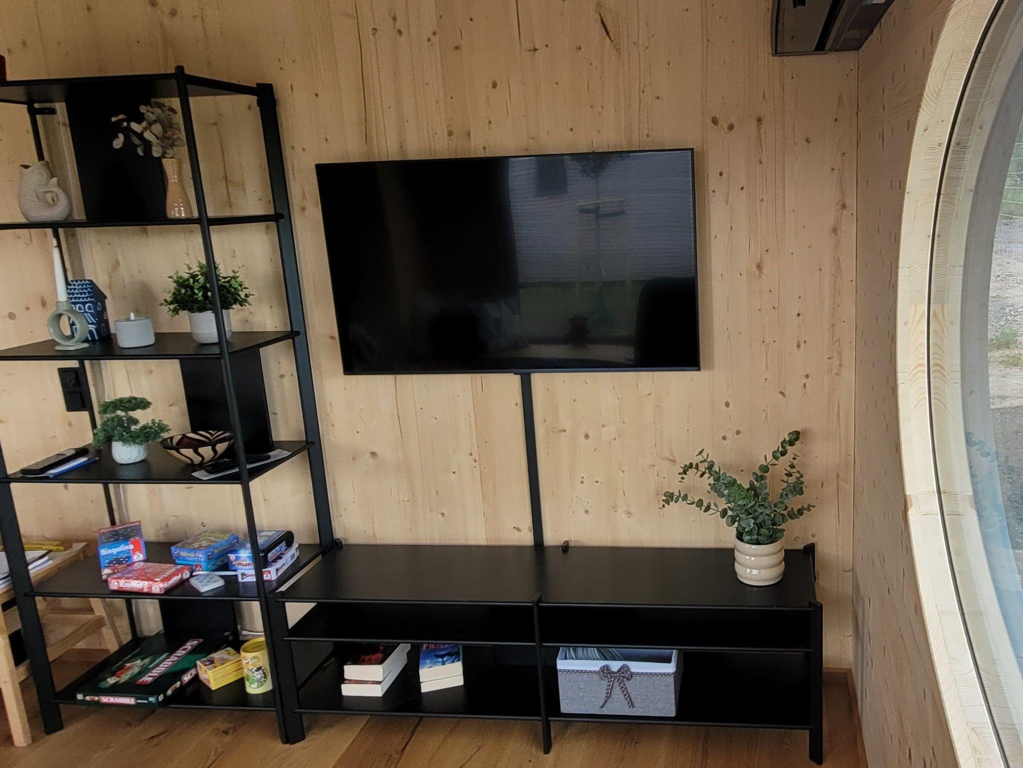 Wohnzimmer: Flachbildschirm, Leseecke mit Sitzkissen, Esstisch mit 4 Stühlen, Sesse, Sitzsack, Spiele & Bücher