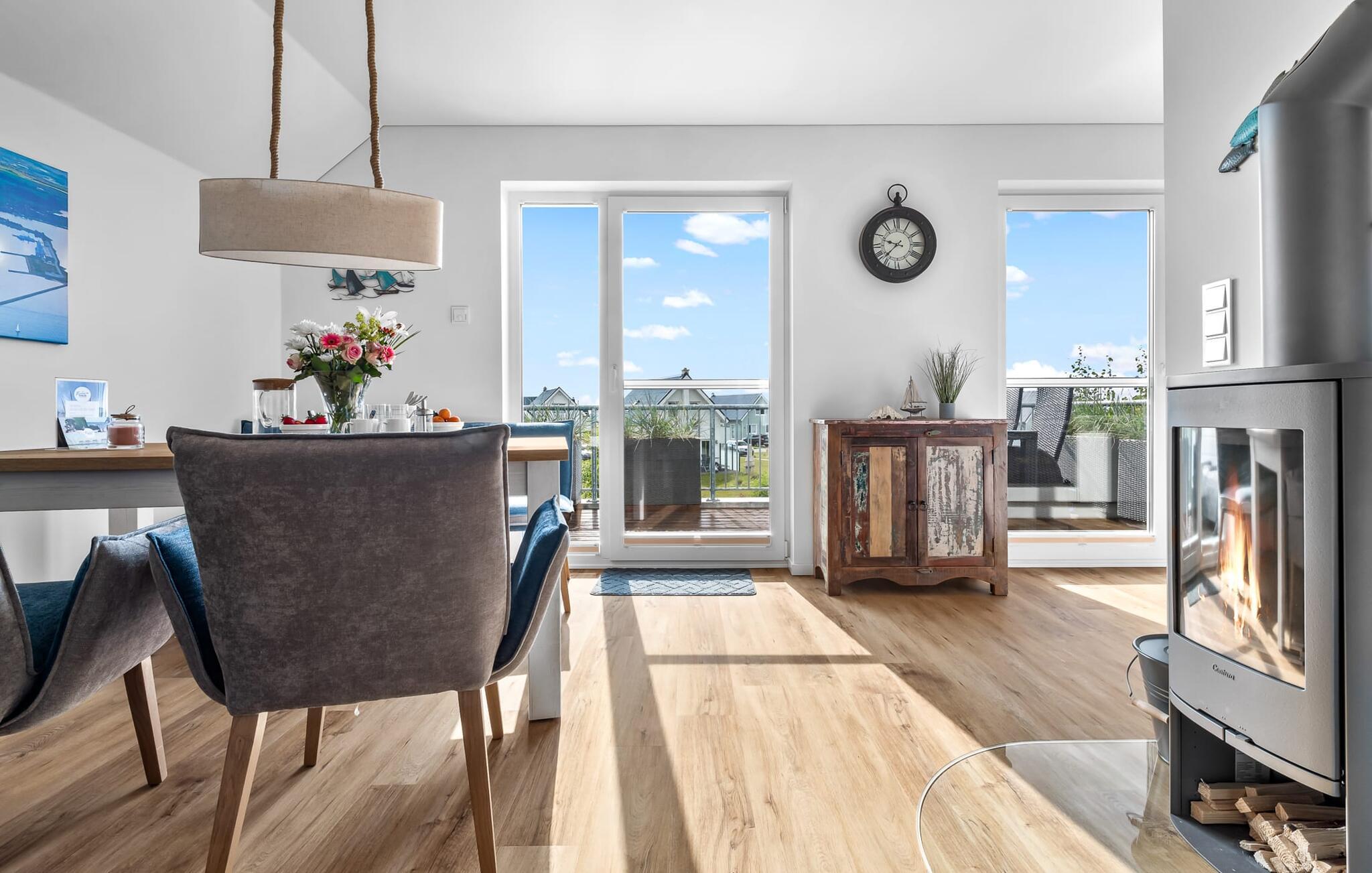 Ferielejlighedens opholds- og spisestue ligger badet i lys, med panoramavindue fra gulv til loft ud mod de tilstødende altaner på begge sider. En lille oase til at afslutte den travle dag på jeres ferie og nyde hyggelige grillaftener.