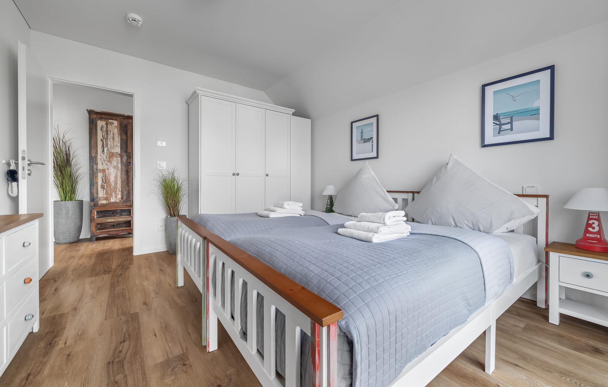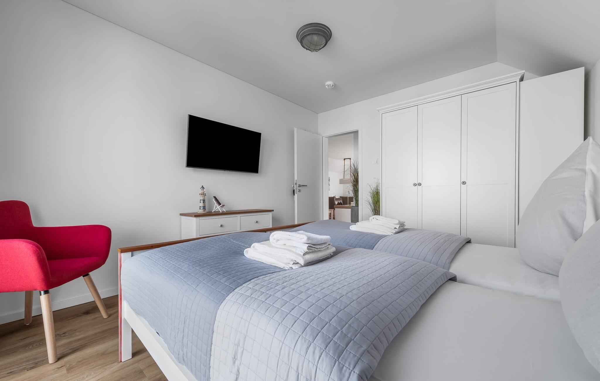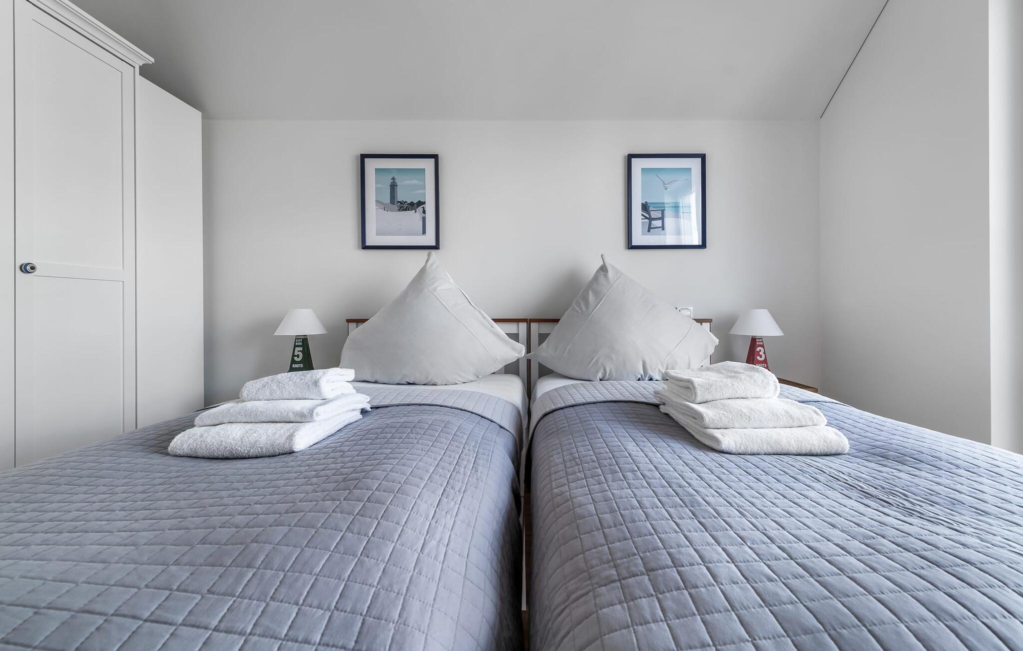 Soveværelserne er også stilfuldt indrettet. Det store soveværelse har en stor dobbeltseng. Det andet soveværelse med to komfortable enkeltsenge sikrer jer afslappende nætter. Begge værelser har fladskærms-tv.