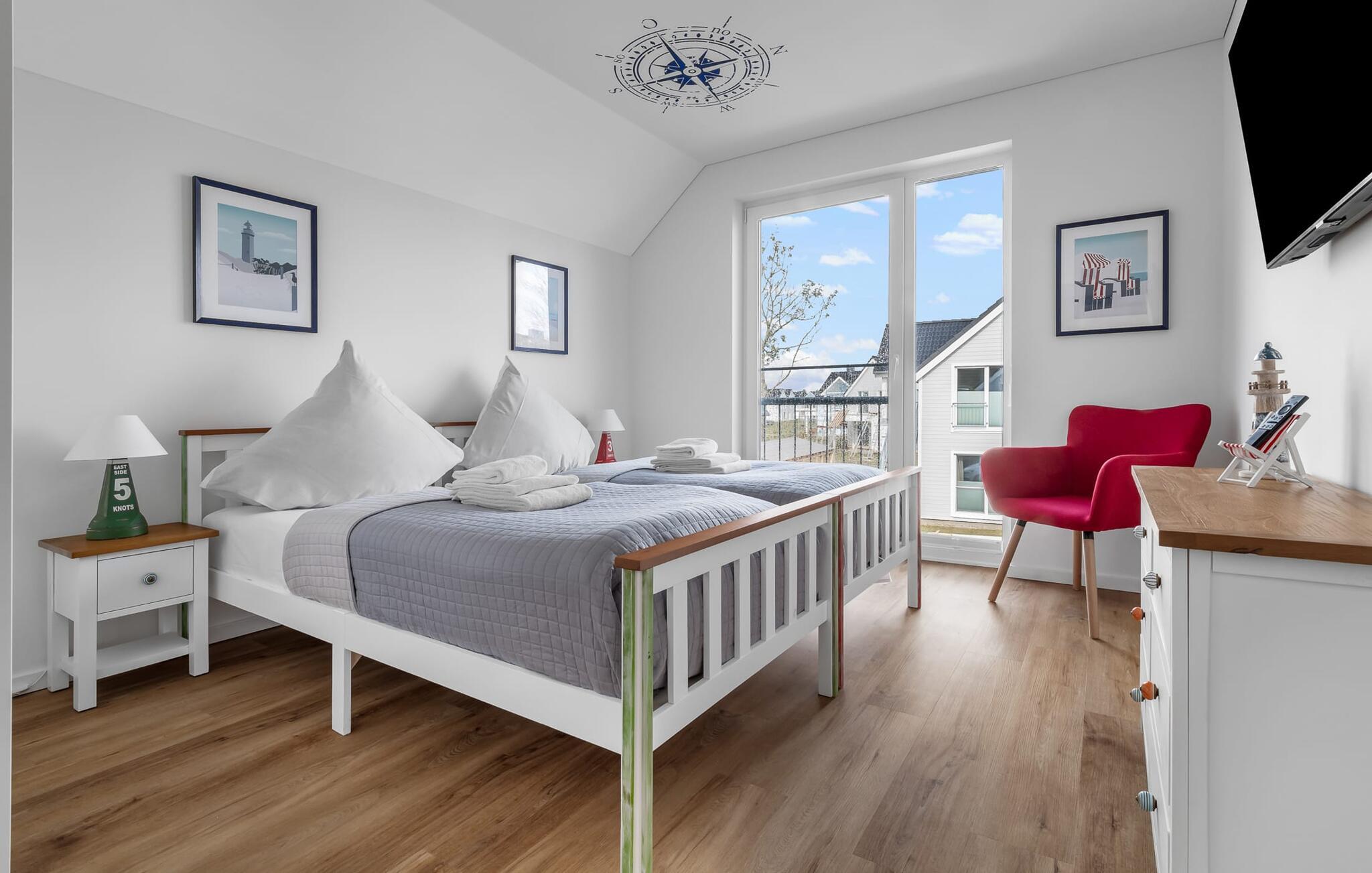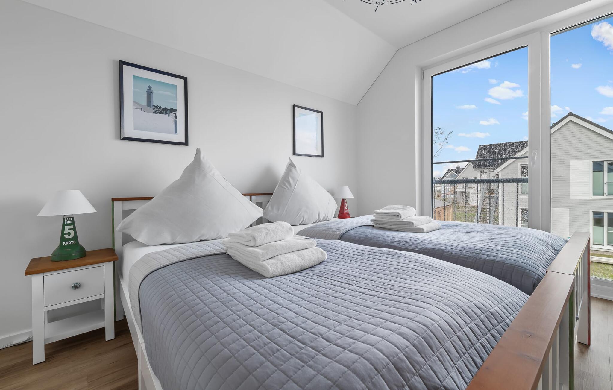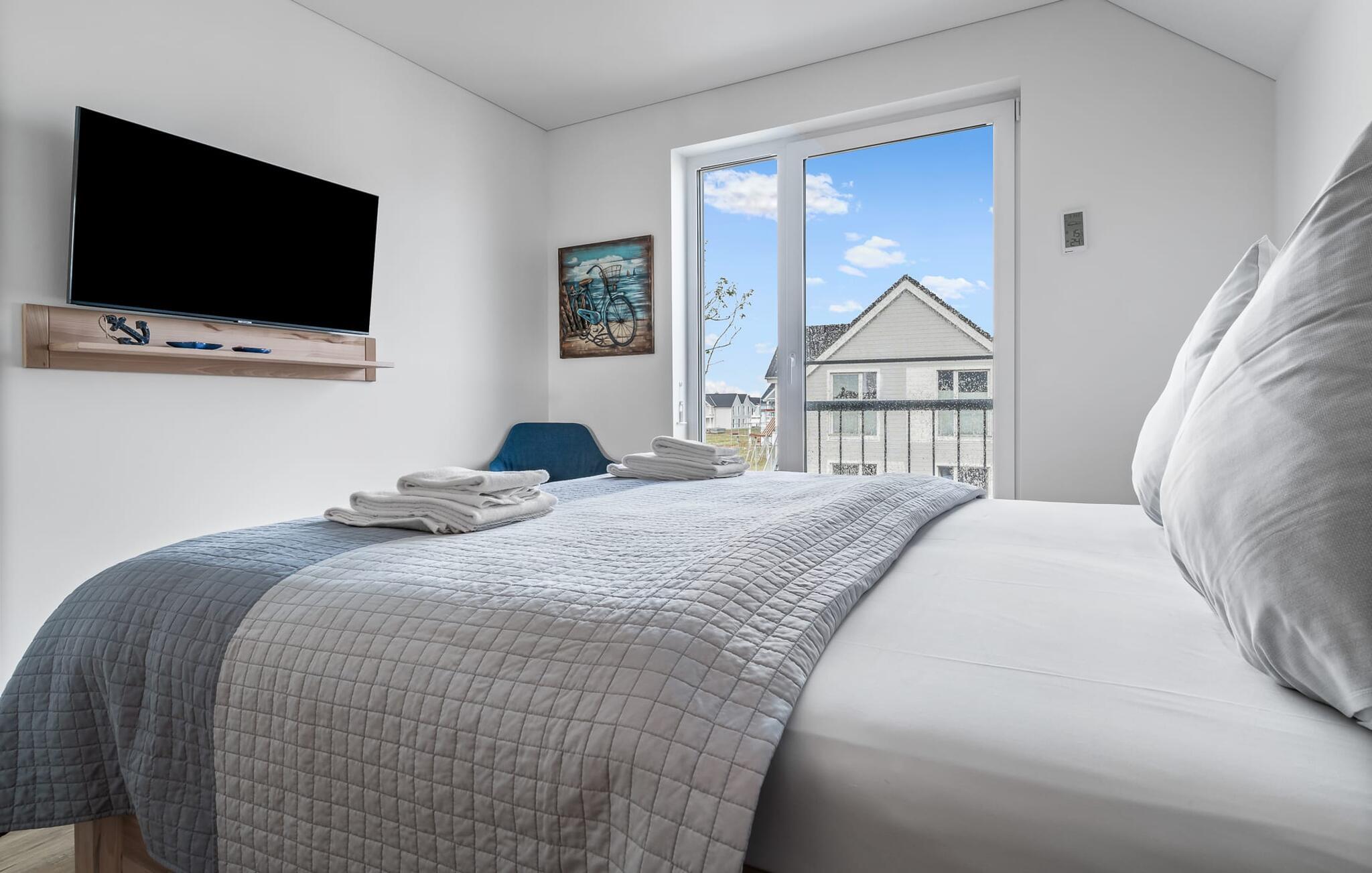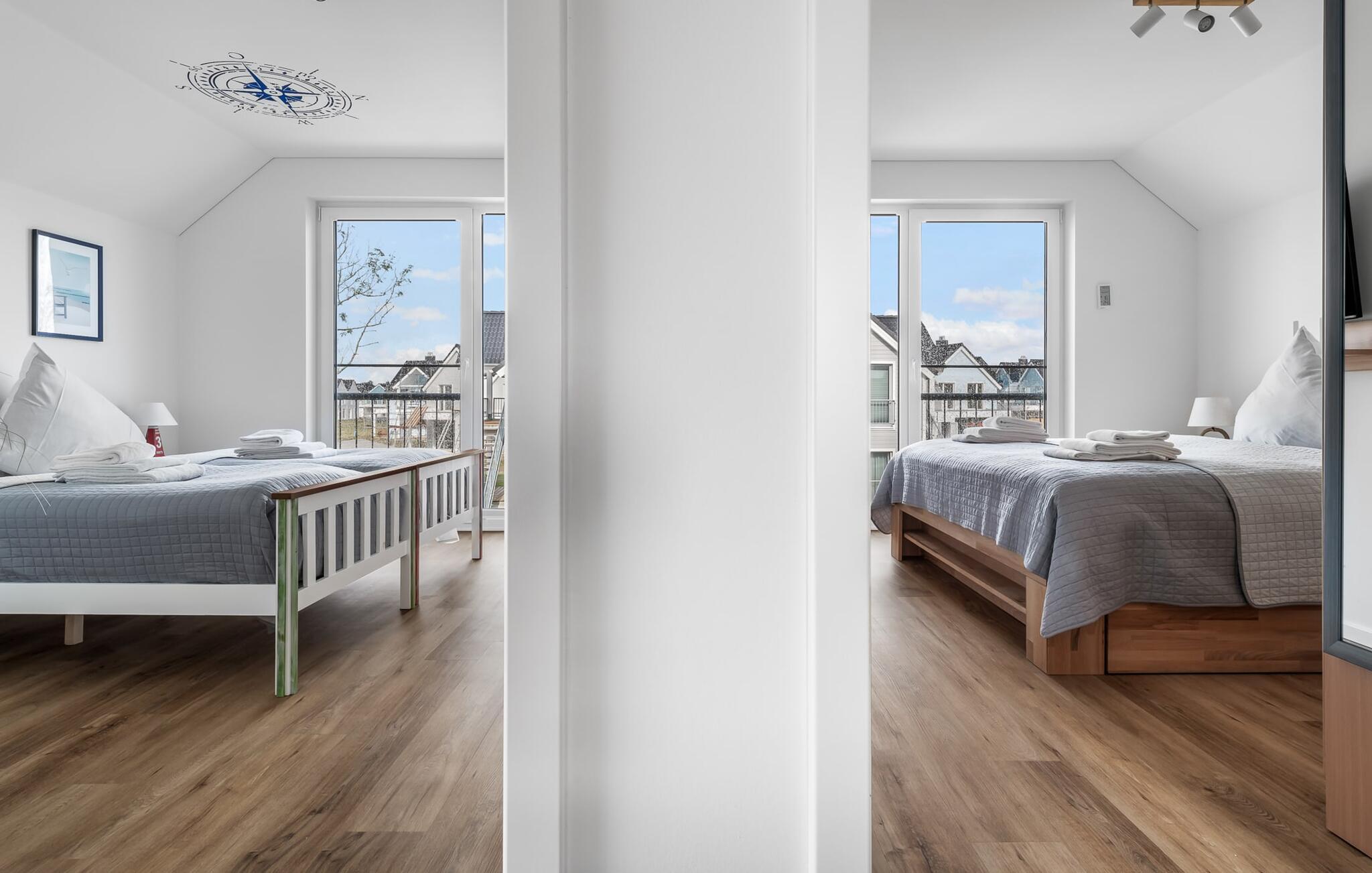 Soveværelserne er også stilfuldt indrettet. Det store soveværelse har en stor dobbeltseng. Det andet soveværelse med to komfortable enkeltsenge sikrer jer afslappende nætter. Begge værelser har fladskærms-tv.