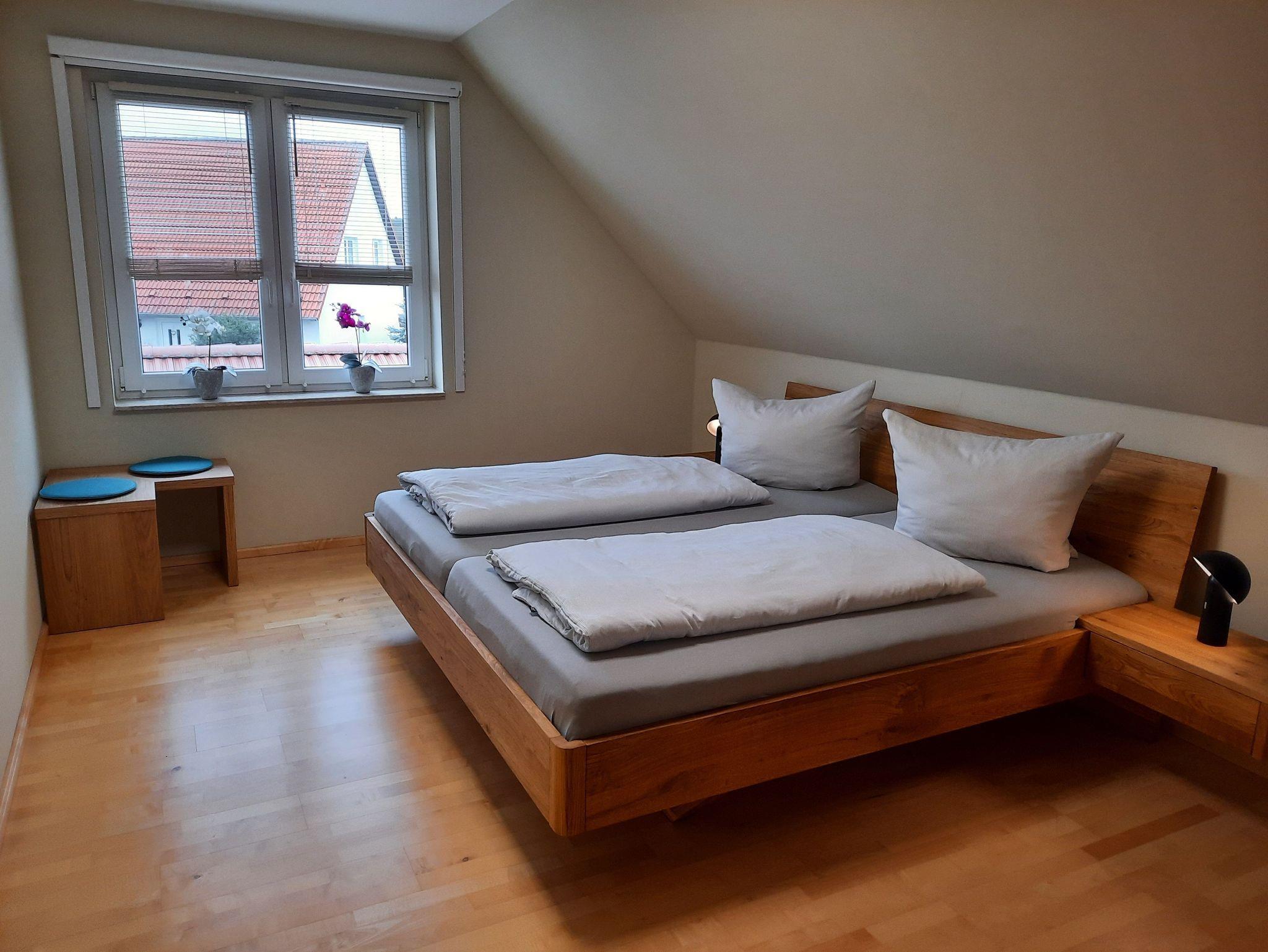 Die Ferienwohnung ist gemütlich, komfortabel und den heutigen Anforderungen entsprechend eingerichtet. Die 54 m² große Wohnung befindet sich im Obergeschoss eines Einfamilienhauses. Ausgestattet ist sie für 2 bis 4 Personen. Die Ferienwohnung verfügt über einen Schlafraum mit großzügigem Doppelbett, einem Wohnraum mit halb offener Küche und Essecke sowie ein Bad mit Du/WC. Auf Ihre Kinder wartet ein hauseigener Spielplatz mit Sandkiste, Schaukel, Tutsche und Klettergerüst. Ihren Pkw können Sie auf den bereit gestellten Parkplätzen direkt bei den Ferienwohnungen parken. Kinderreisebett und Hochstuhl auf Anfrage.
