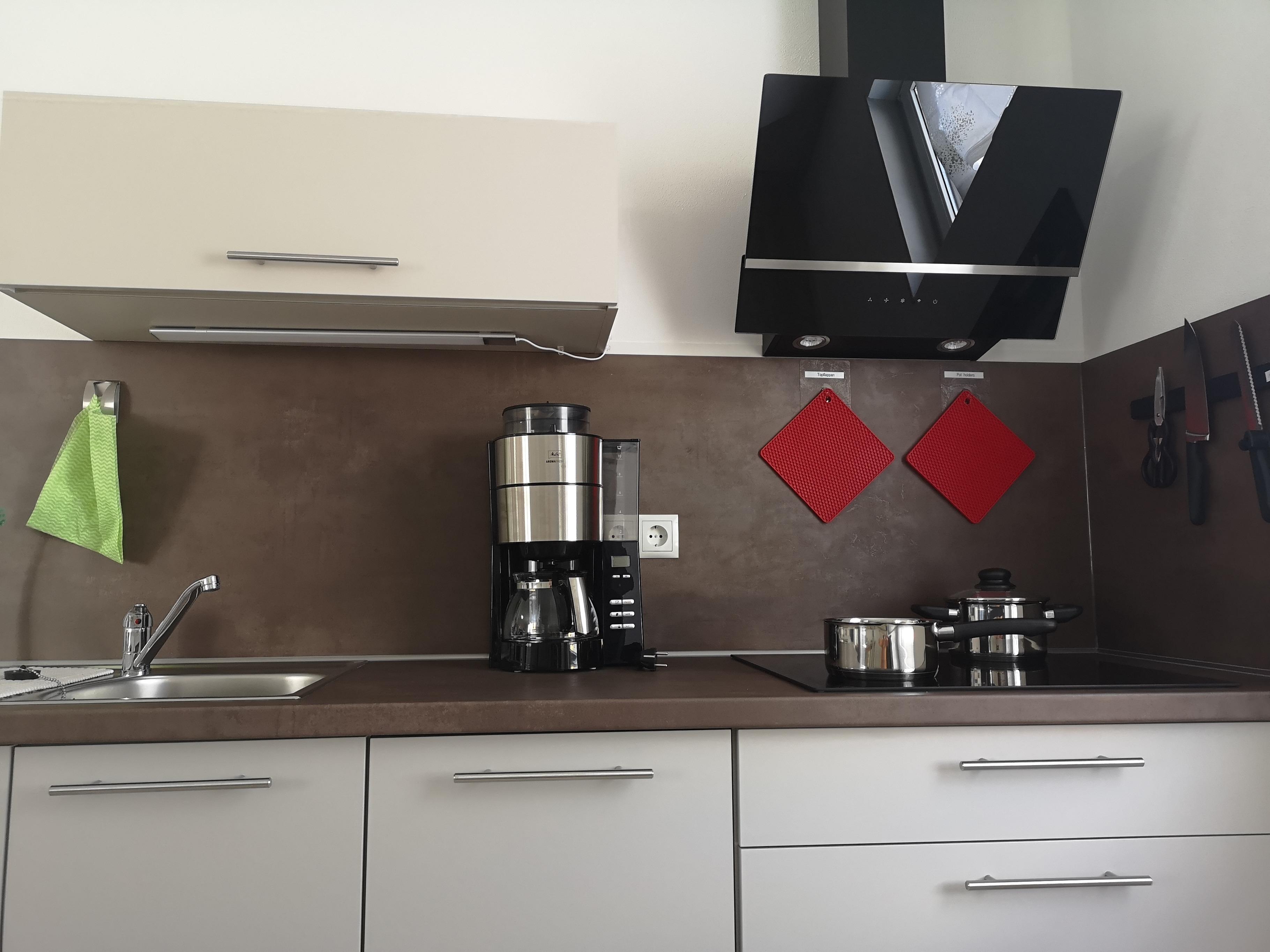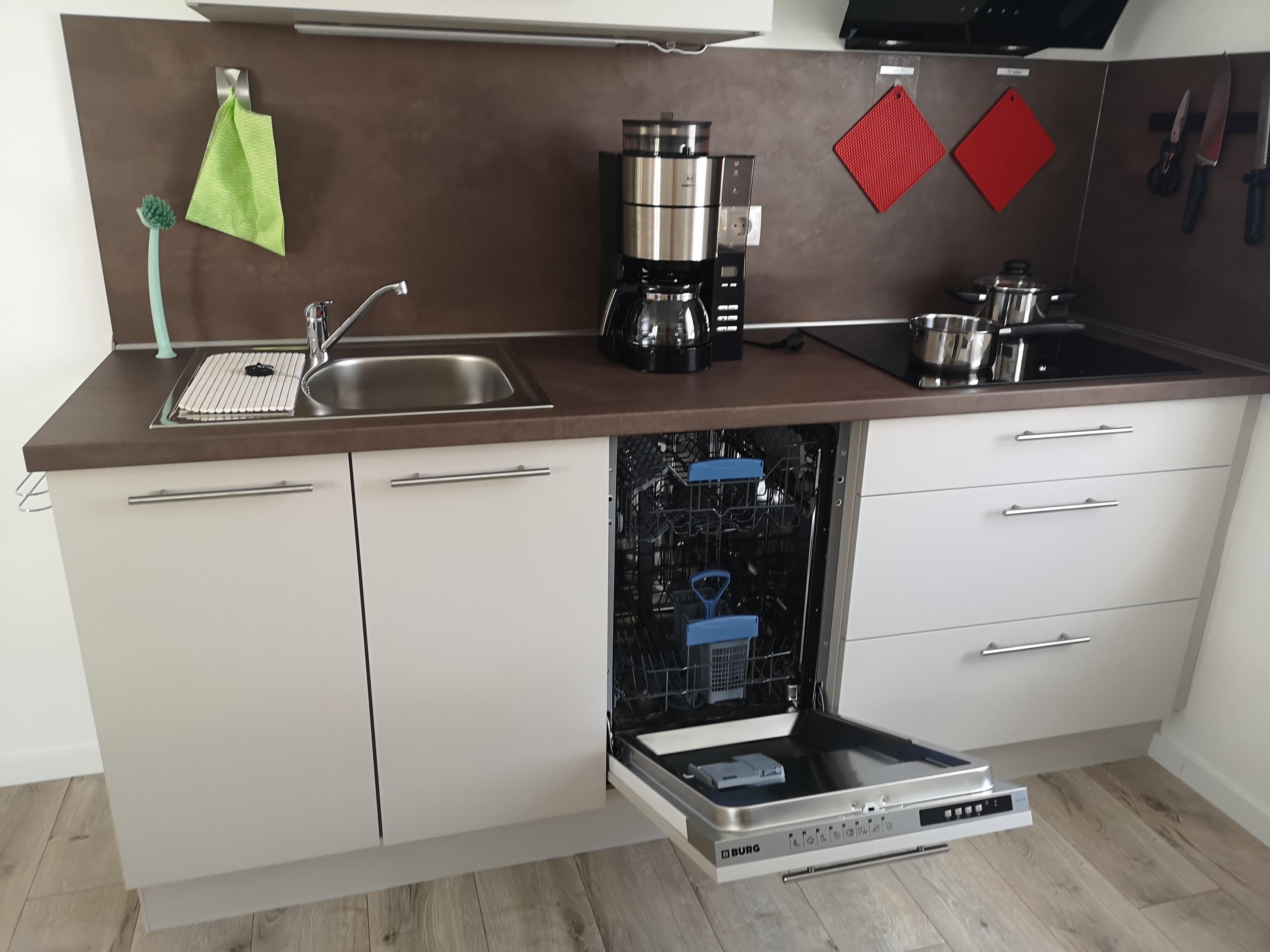 Küche: Induktionskochfeld, Kaffeemaschine mit Mahlwerk wahlweise auch mit Kaffeepulver zu befüllen, Eierkocher, Reinigungsutensilien auch für die Spülmaschine vorhanden.
