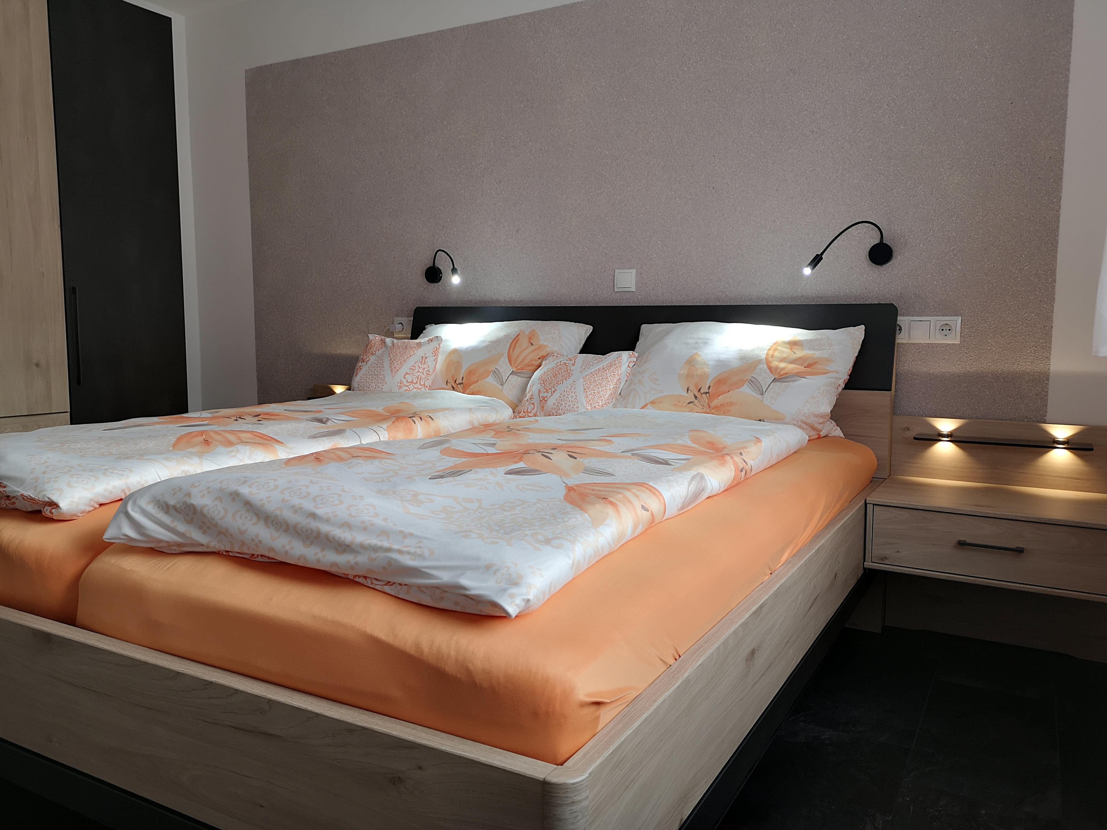 Schlafzimmer: Härte der Matratze wählbar (H3 oder H4), Bettdecken in Übergröße (155x220 cm), Kopfkissen in verschiedenen Größen wählbar.