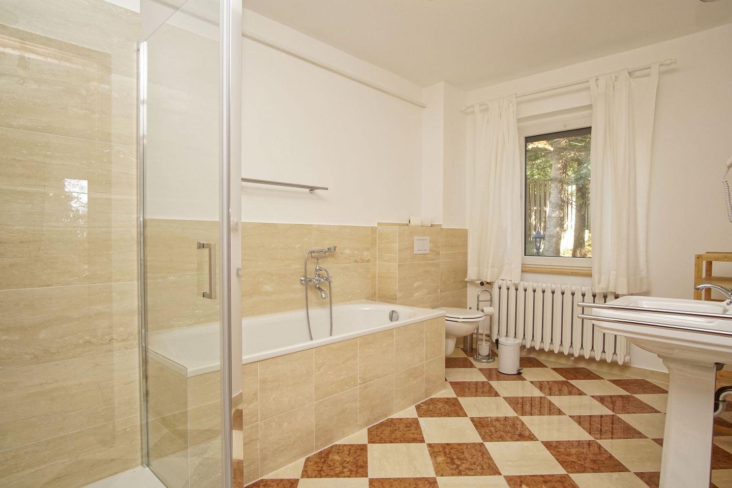 BAD // Badezimmer mit Dusche, Badewanne, WC, Waschbecken und Fenster, Zugang zum Wintergarten ++