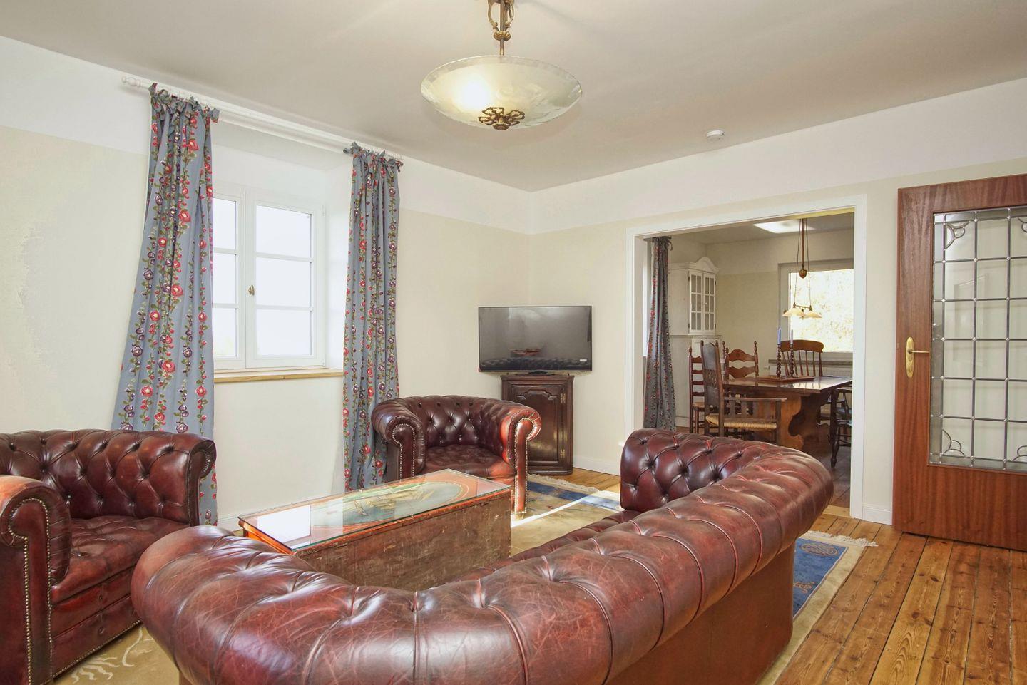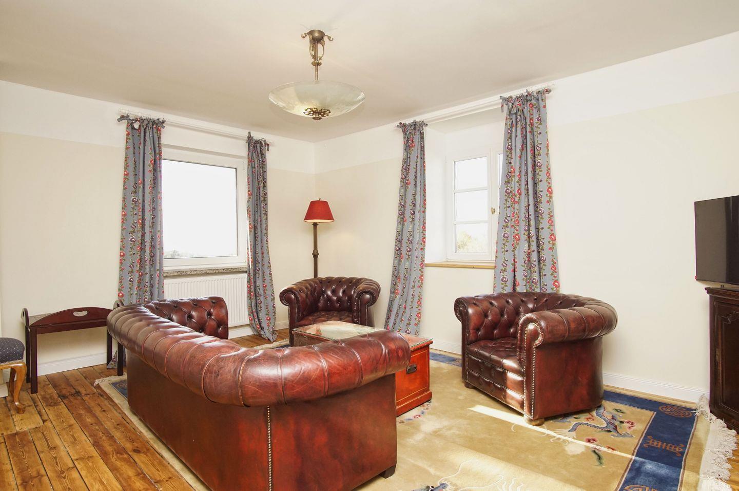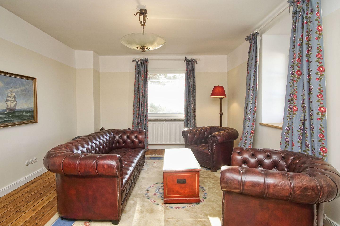 WOHNEN // Wohnzimmer im Obergeschoss mit bequemer Ledercouch und Ledersessel, Flachbild-TV, Meerblick ++