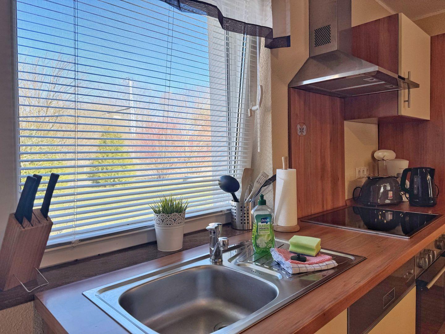 Küchenausstattung: Herd, Backofen, Kühlschrank, Gefrierfach, Spülmaschine, Kaffeemaschine, Toaster, Wasserkocher