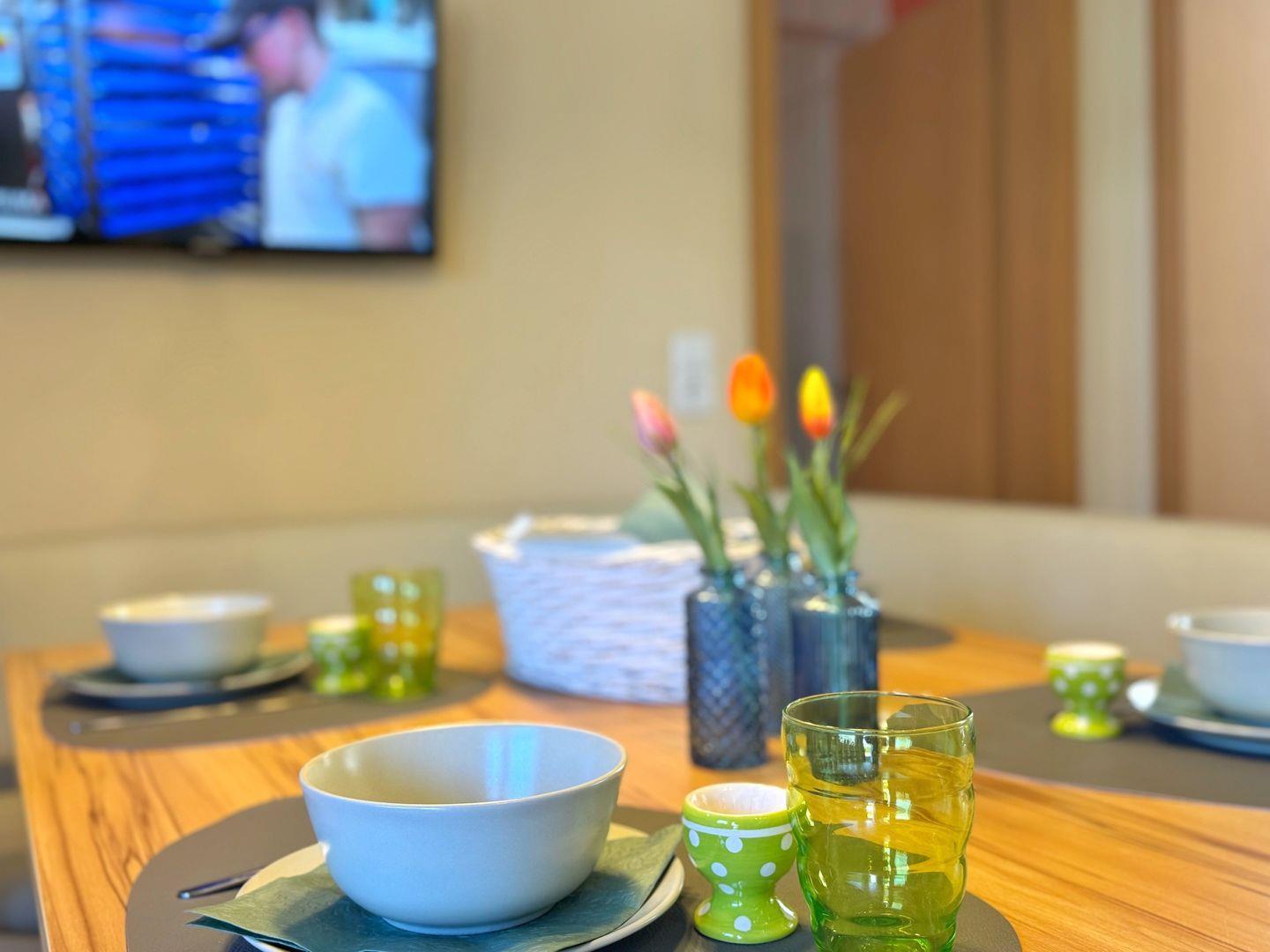 Wohnzimmer mit integrierter Küchenzeile, Esstisch, Couchgarnitur, Flachbild-TV, Radio, WLAN