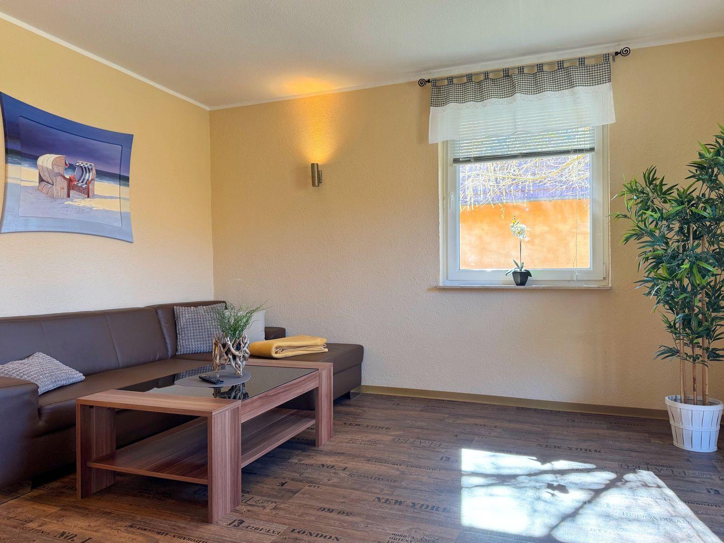 Wohnzimmer mit integrierter Küchenzeile, Esstisch, Couchgarnitur, Flachbild-TV, Radio, WLAN
