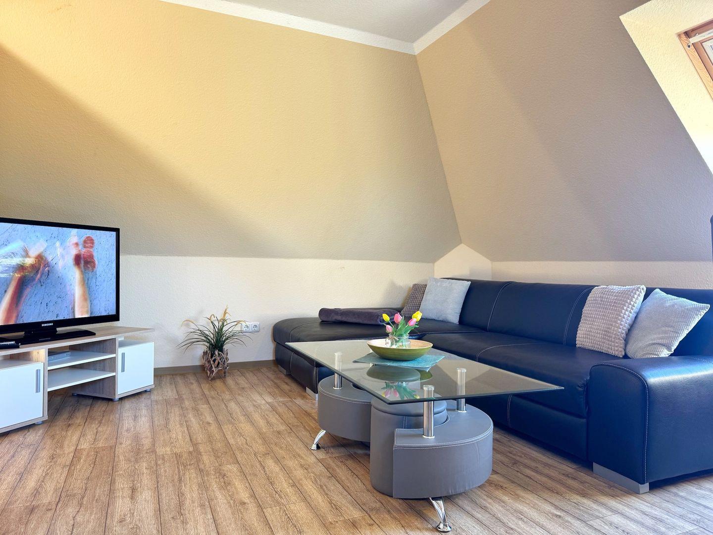 Wohnzimmer mit integrierter Küchenzeile, Esstisch, Couchgarnitur, Flachbild-TV, Radio, WLAN