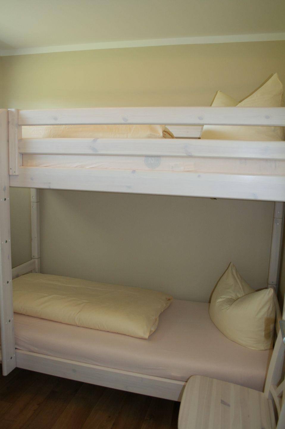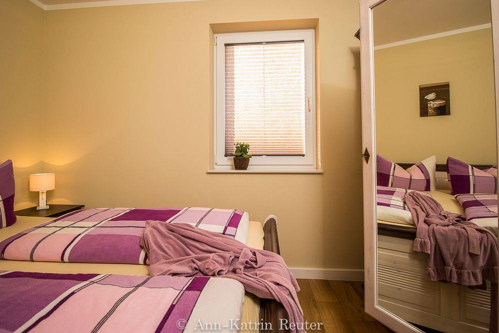 Über einen separaten Eingang gelangen Sie in die untere Ebene der modern eingerichteten Ferienwohnung. Hier finden Sie das Elternschlafzimmer mit Doppelbett, das Kinderschlafzimmer mit 2 Einzelbetten (bzw. mit Doppelstockbetten in den Wohnungen Fischmöwe und Silbermöwe) sowie das Badezimmer mit Dusche und WC.