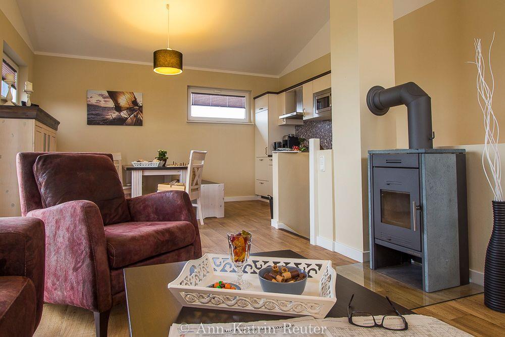 Über eine Treppe gelangen Sie in den großen und modern eingerichteten Wohnbereich mit offener Küche. Eine behagliche Sitzecke mit Flachbildfernseher und Kamin lädt zum Verweilen ein. In der komplett ausgestatteten Küchenzeile finden Sie unter anderem einen Ceranherd mit Backofen, eine Geschirrspülmaschine sowie eine Mikrowelle.
