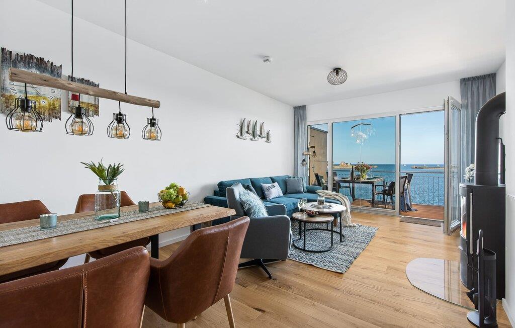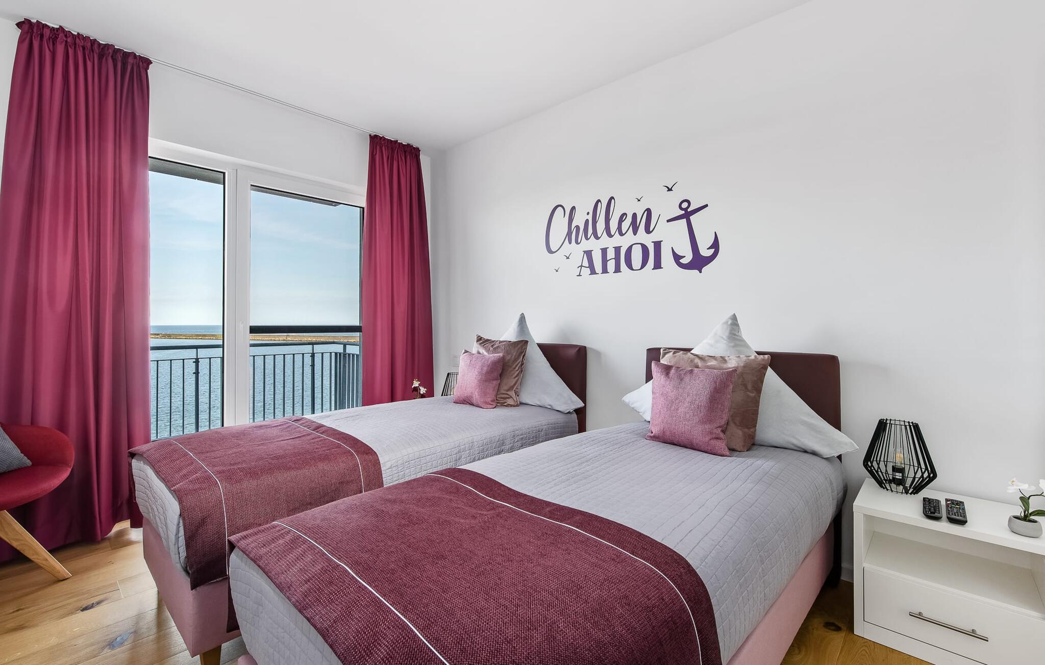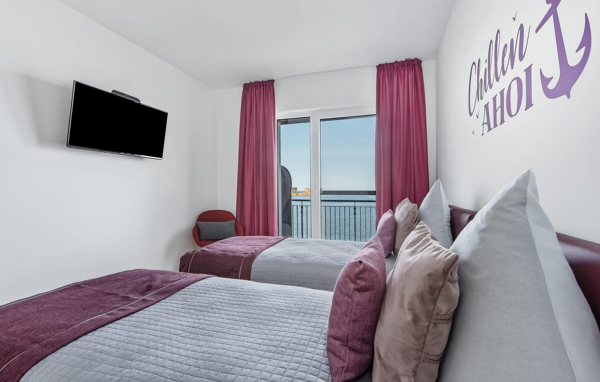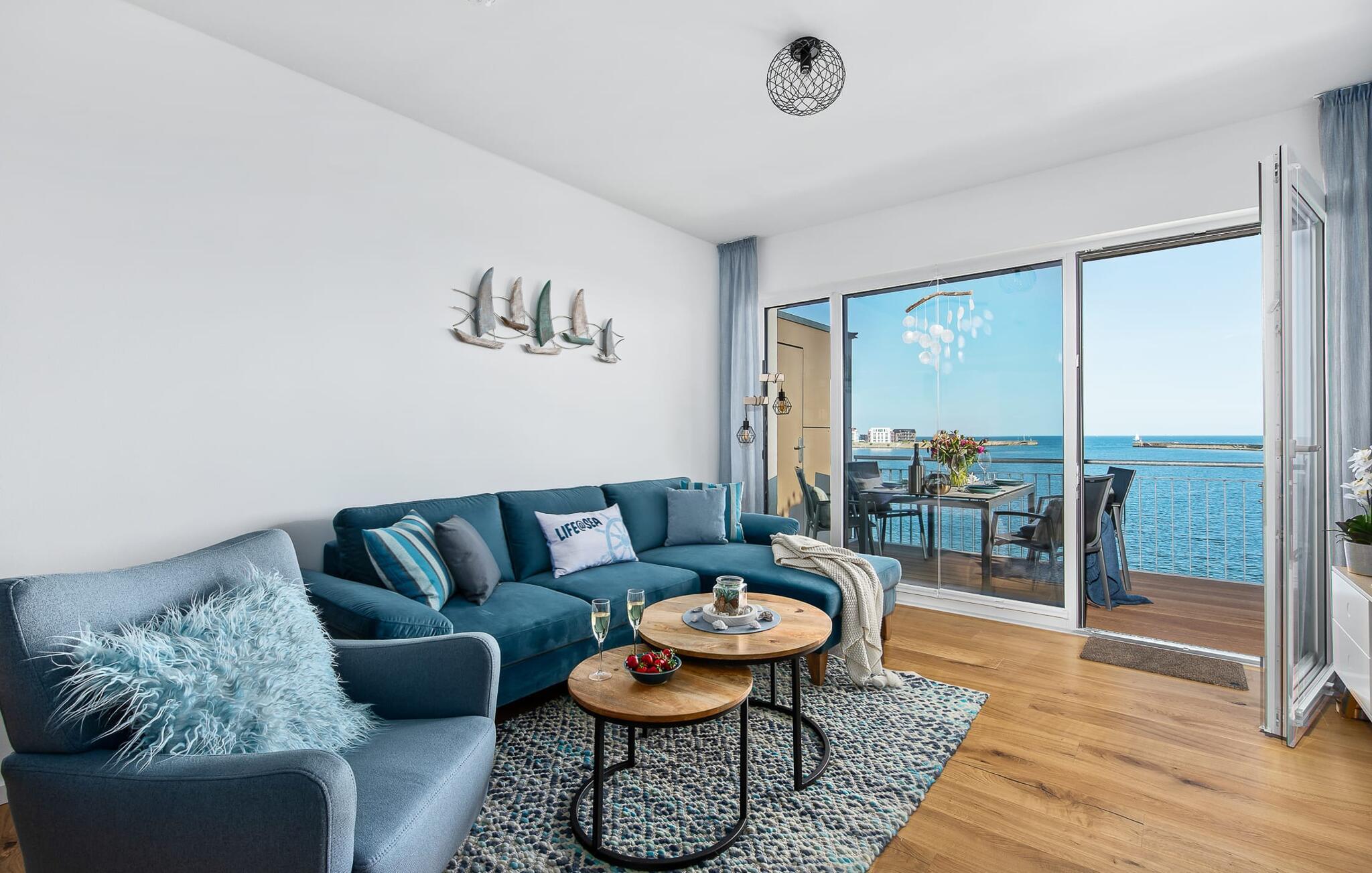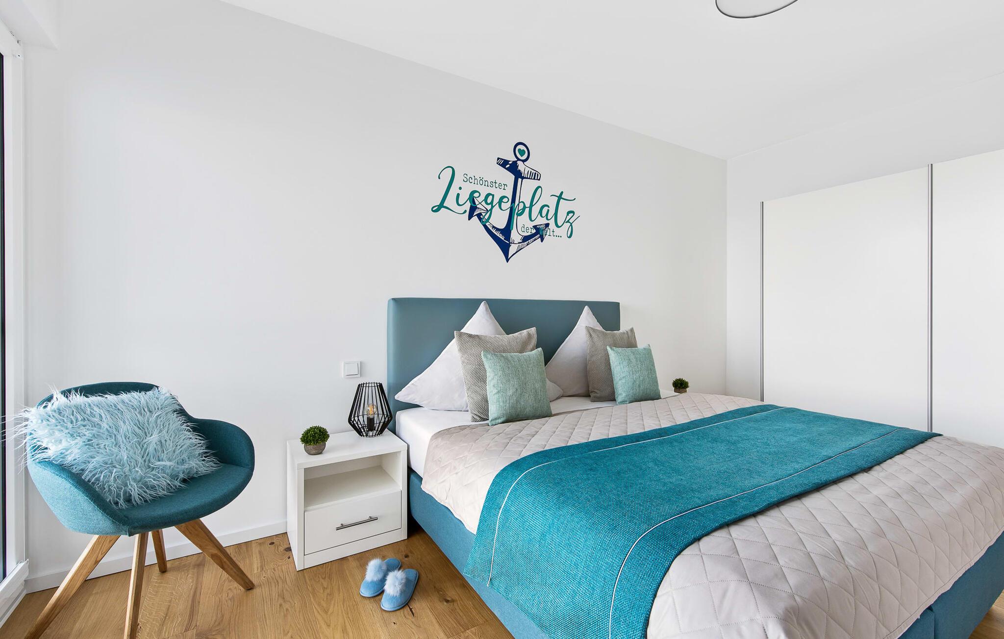 Beliggende direkte ved Østersøen lever LIFE@SEA ferielejligheden op til sit navn. Direkte ved vandet scorer ferielejligheden med en fantastisk havudsigt, nærheden til Weidefelder sandstrand og den umiddelbare adgang til havnepromenaden i ferieområdet Olpenitz. Udsigten fra stuen og soveværelset falder gennem gulv-til-loft vinduer og fra balkonen til det store hav. Når vejret er godt, kan I se så langt som til de danske øer. Ferielejligheden er indrettet til høj standard, barrierefri, oversvømmet med lys og smagfuldt indrettet. Placeret over tingene kan sejlskibe, der passerer ved havneindløbet, ses fra hele opholds-/spiseområdet og balkonen. Telekoms hjemmeunderholdningsprogram tilbyder ekstra underholdning på fladskærms-tv'et i stuen og på to ekstra tv'er i soveværelserne. Ferie er en tid til at være kreativ ved komfuret igen. Det fuldt udstyrede, åbne køkken lader intet tilbage at ønske. Her kan man fremtrylle lækre feriemåltider og altanen indbyder til en grillaften med udsigt til vandet. Bruserummet har et stort brusebad på gulvniveau. Det hyggelige soveværelse, udstyret med en dobbeltseng med boxmadrasser og et ekstra fladskærms-tv, giver mulighed for en afslappende feriesøvn. Det andet soveværelse byder på yderligere to boksmadrasser. Denne ferielejlighed tilbyder også et hus til jeres bil og cykel, som begge er placeret i den underjordiske parkeringsplads (indgangshøjde: 2m). Herfra kan I nemt tage elevatoren til jeres ferieidyl på anden sal. Vores yndlingssted: Nyd den vide udsigt over havet fra strandstolen og se de store og små skibe sejle forbi... det er LIFE@SEA! Bemærk venligst: OstseeResort Olpenitz er meget populært, og der bygges fortsat i parken. Ikke desto mindre kan I se frem til en 5-stjernet standard og et førsteklasses ophold. Byggeaktiviteterne kommer ikke til at forstyrre jer på ferien, og derfor gives der ikke yderligere afslag i prisen.