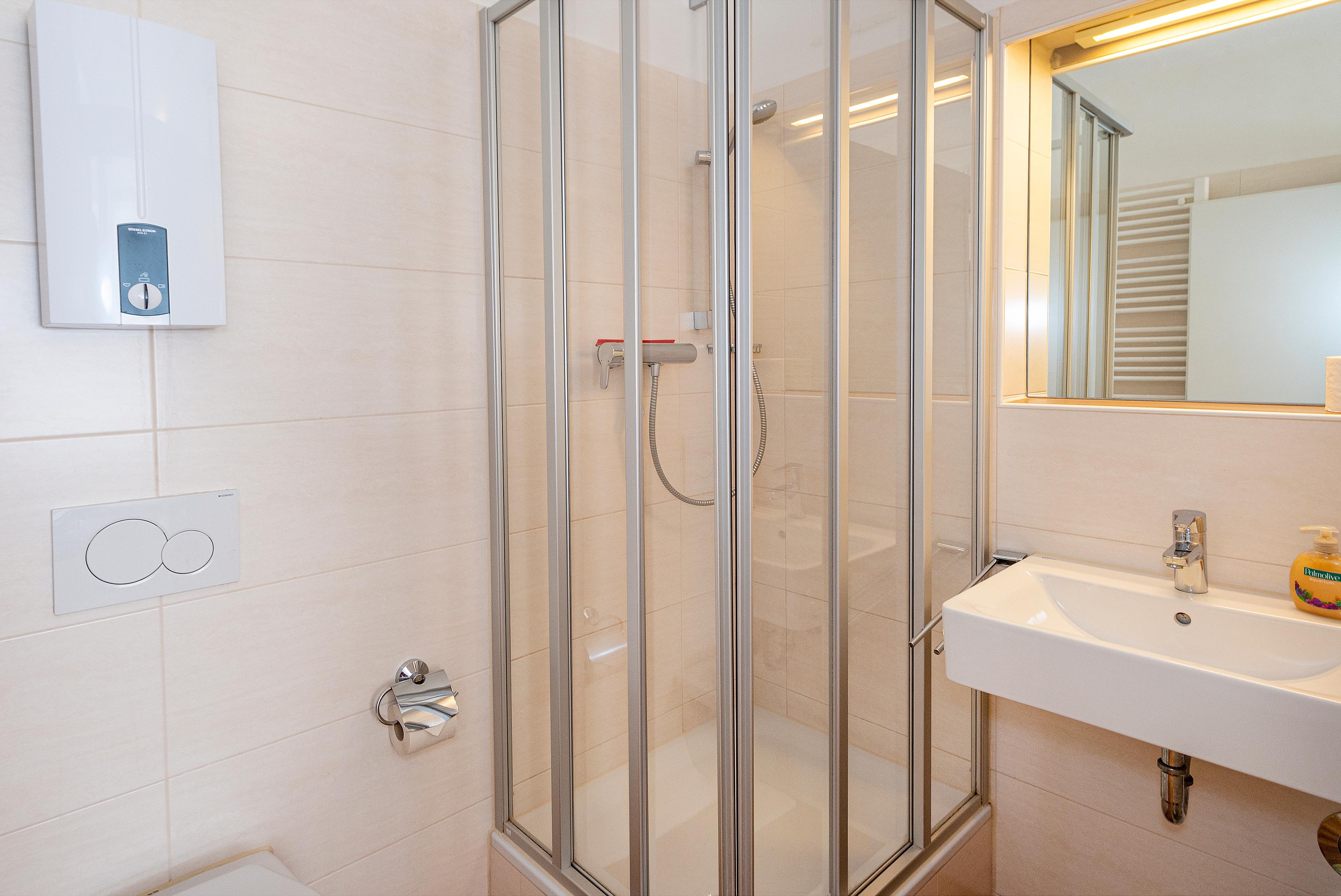 Im modernen, hellen Duschbad hält der Heizkörper warme Handtücher für Sie bereit.