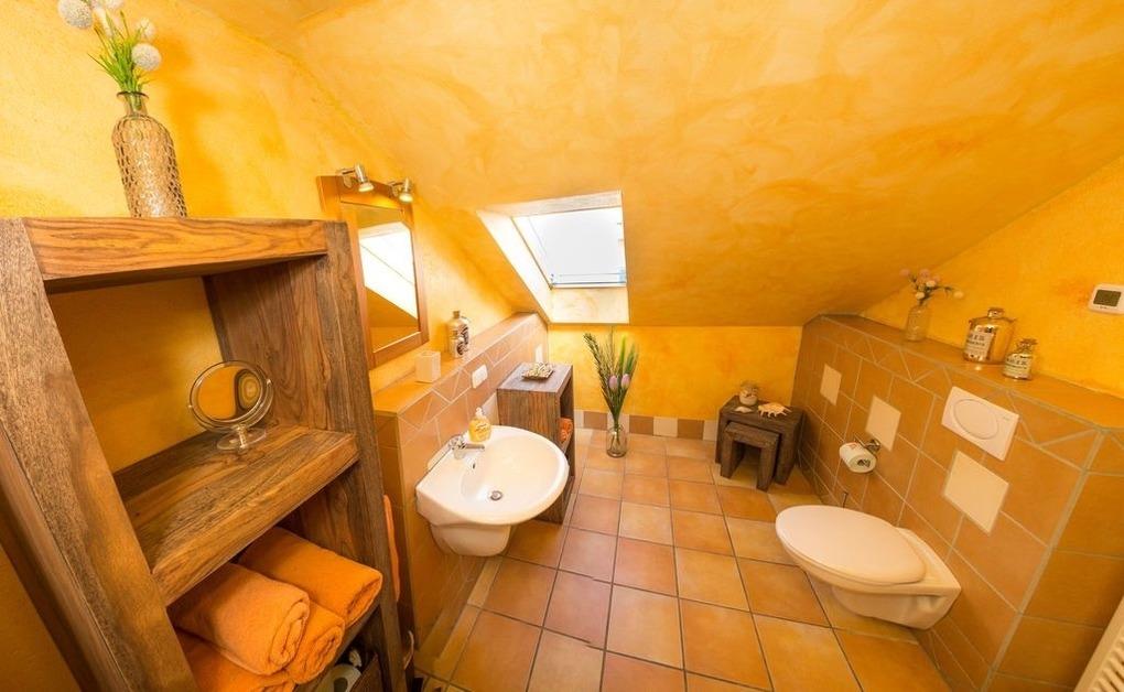 1 geräumiges Bad mit Dusche, WC mit mediterranem Flair