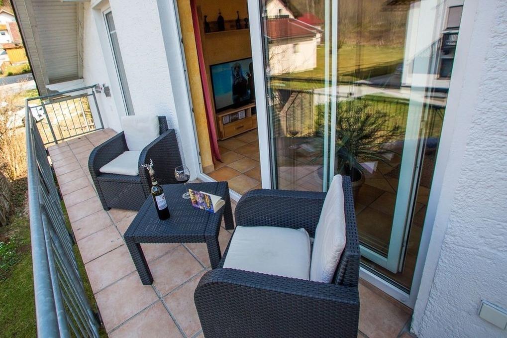 1 Wohnzimmer mit Echt-Ledercouch, 48-Zoll-LED, Doppel-Terrassentür zum großen Balkon mit kleiner Sitzgruppe