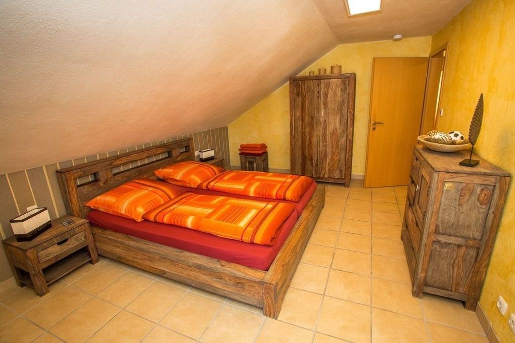 1 Schlafzimmer mit Doppelbett und Massivmöbeln in warmen Farbtönen; Tisch mit 2 Stühlen; Blick auf den wunderschönen Garten