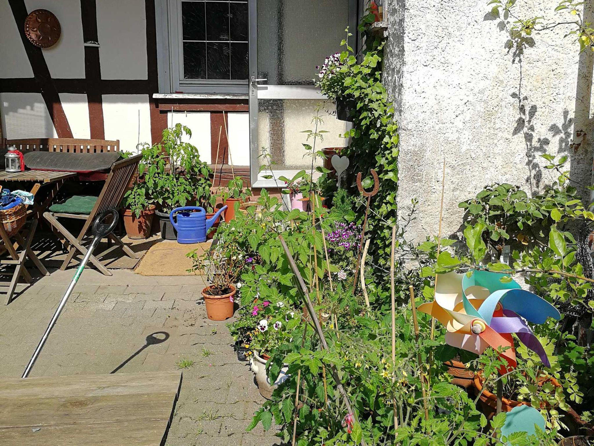 Gerne kann auch der Hof/Garten und die kleine Terasse zum Sitzen/Entspannen/Grillen genutzt werden. Kinder können gerne unsere Kaninchen im Garten besuchen.